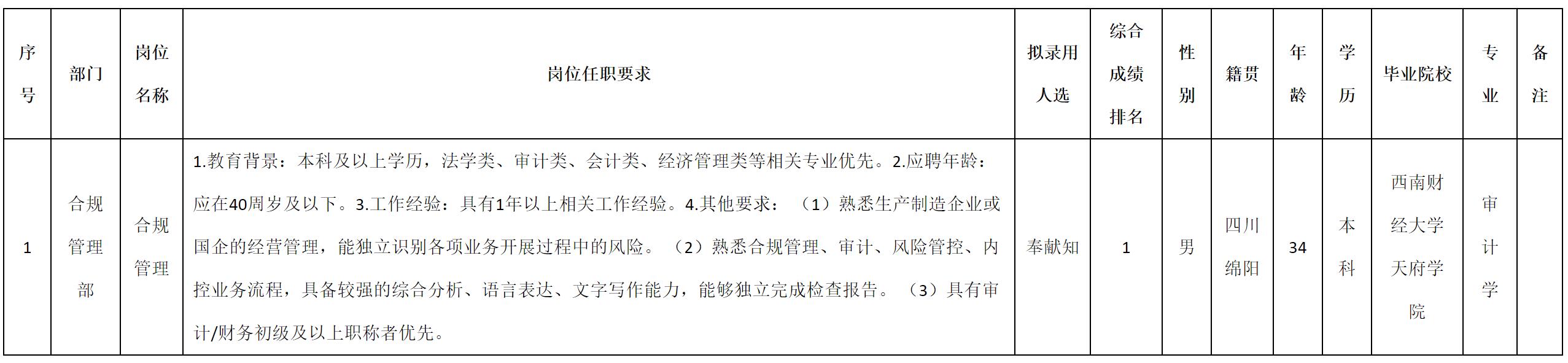 根據(jù)四川九州電子科技股份有限公司發(fā)布的招聘公告及招聘相關(guān)規(guī)定,經(jīng)測試、考察、體檢等程序,擬錄用奉獻(xiàn)知同志到四川九州電子科技股份有限公司工作,現(xiàn)予以公示,具體情況如下: