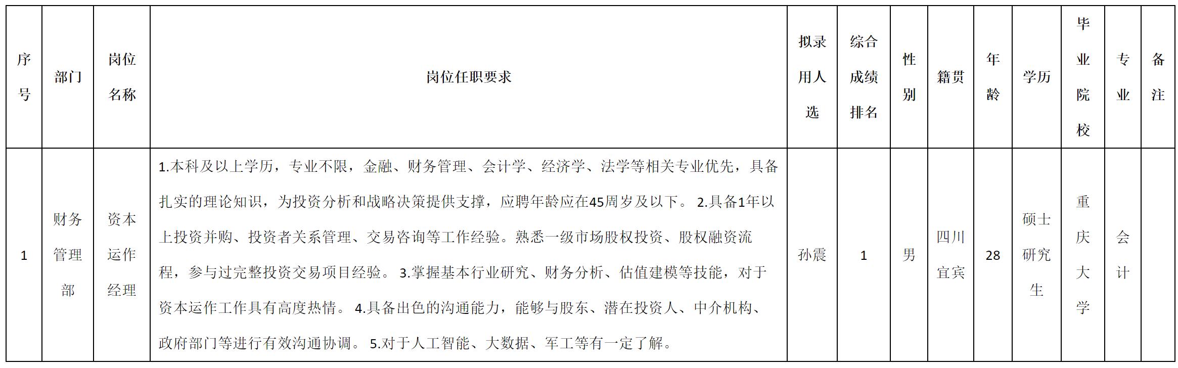 根據(jù)四川九洲投資控股集團(tuán)有限公司軟件與數(shù)據(jù)智能軍團(tuán)發(fā)布的招聘公告及招聘相關(guān)規(guī)定,經(jīng)測(cè)試、考察、體檢等程序,擬錄用孫震同志到四川九洲投資控股集團(tuán)有限公司軟件與數(shù)據(jù)智能軍團(tuán)工作,現(xiàn)予以公示,具體情況如下: