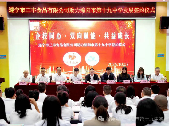 “感恩教育、反哺社會,是企業(yè)發(fā)展的初心與使命。”遂寧市三豐食品有限公司懷揣社會責任躬身入局,為教育發(fā)展增添民生溫度。遂寧市三豐食品有限公司董事長鄧添文在發(fā)言中,道出了企業(yè)參與教育公益的深層邏輯。此次合作中,三豐食品不僅為綿陽十九中設(shè)立 “獎學金、助學金、獎教金”,捐贈教學物資,為學子成長筑夢、為教師發(fā)展賦能,更創(chuàng)新性地提出 “校企互促、共生共贏” 的合作理念,計劃依托綿陽十九中及英才學校的教育資源,為企業(yè)員工提供文化素養(yǎng)提升、家庭教育指導等服務(wù),將企業(yè)社會責任從 “單向的教育捐贈” 升級為 “校企雙向賦能” 的可持續(xù)模式。
