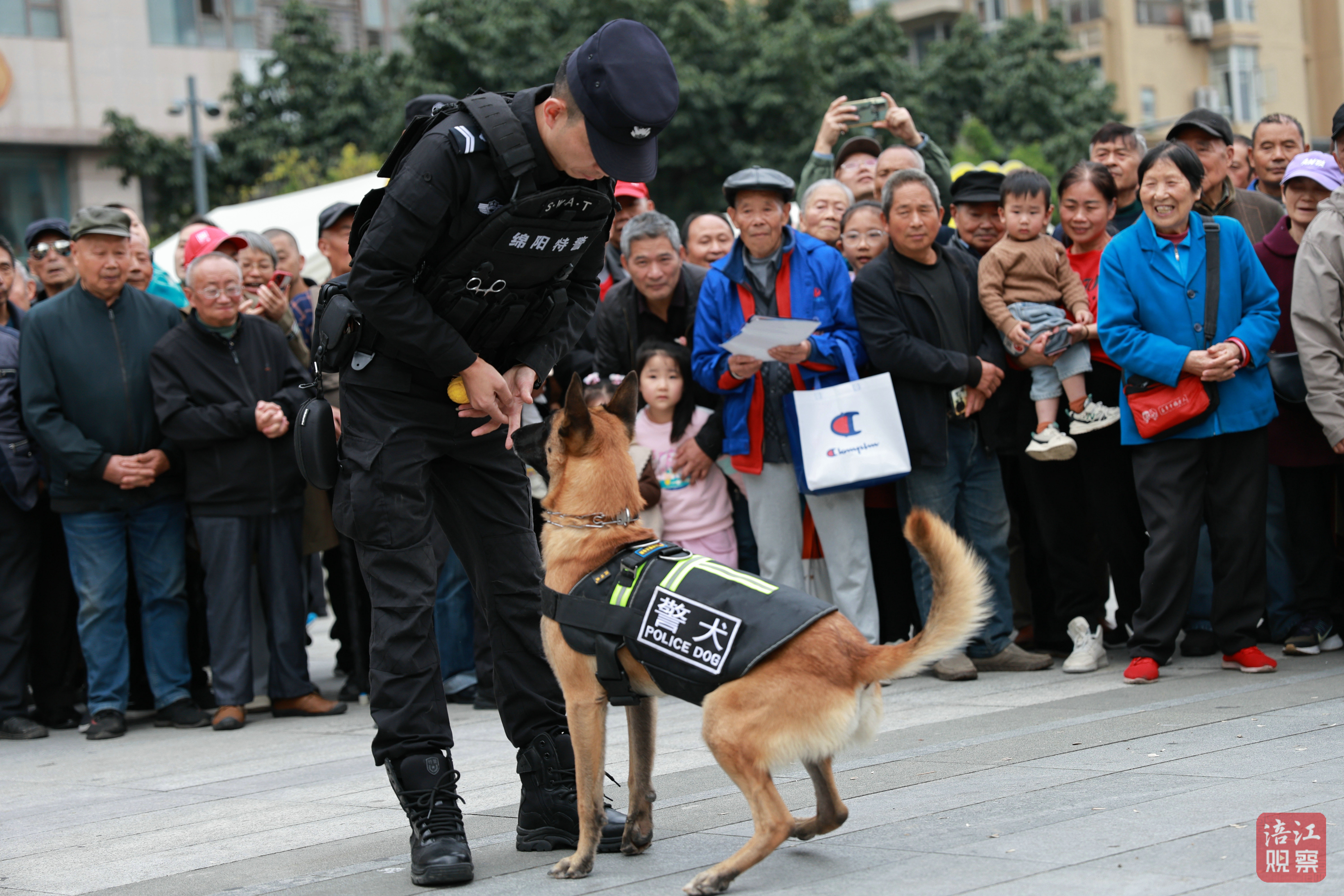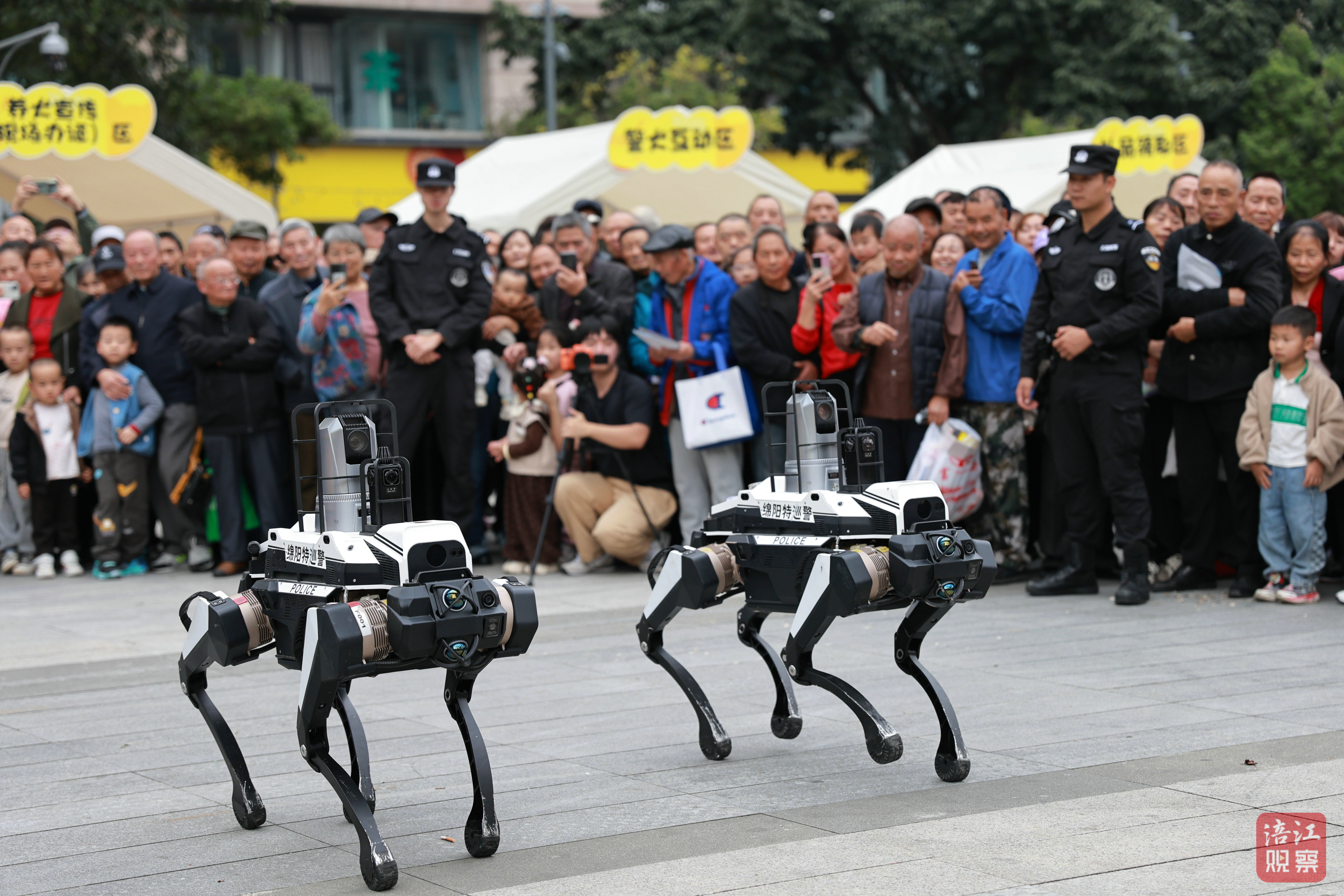 活動(dòng)開(kāi)場(chǎng),2只警犬依次完成坐臥跳躍、搜爆演示等技能展示,緊隨其后的機(jī)器狗則踩著音樂(lè)節(jié)拍扭動(dòng)身軀,引得現(xiàn)場(chǎng)掌聲、歡呼聲不斷。“媽媽快看!那只狗狗好厲害,一下子就跳起來(lái)了!”一位小朋友拉著媽媽的手,眼睛緊緊盯著警犬,興奮地喊道。