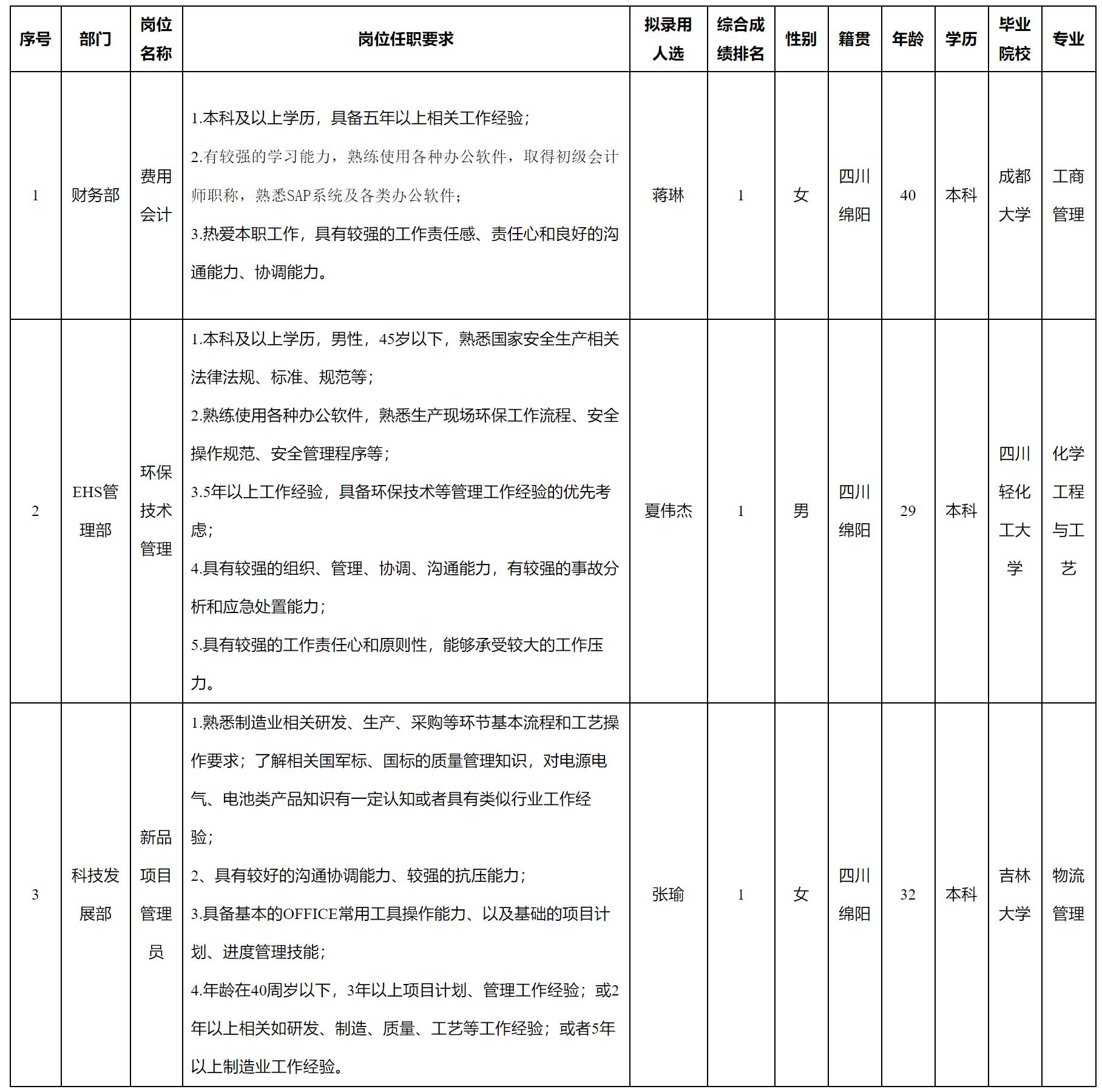 根據(jù)四川長(zhǎng)虹電源股份有限公司發(fā)布的招聘公告及招聘相關(guān)規(guī)定,經(jīng)測(cè)試、考察、體檢等程序,擬錄用蔣琳、夏偉杰、張瑜同志到我司工作,現(xiàn)予以公示,具體情況如下: