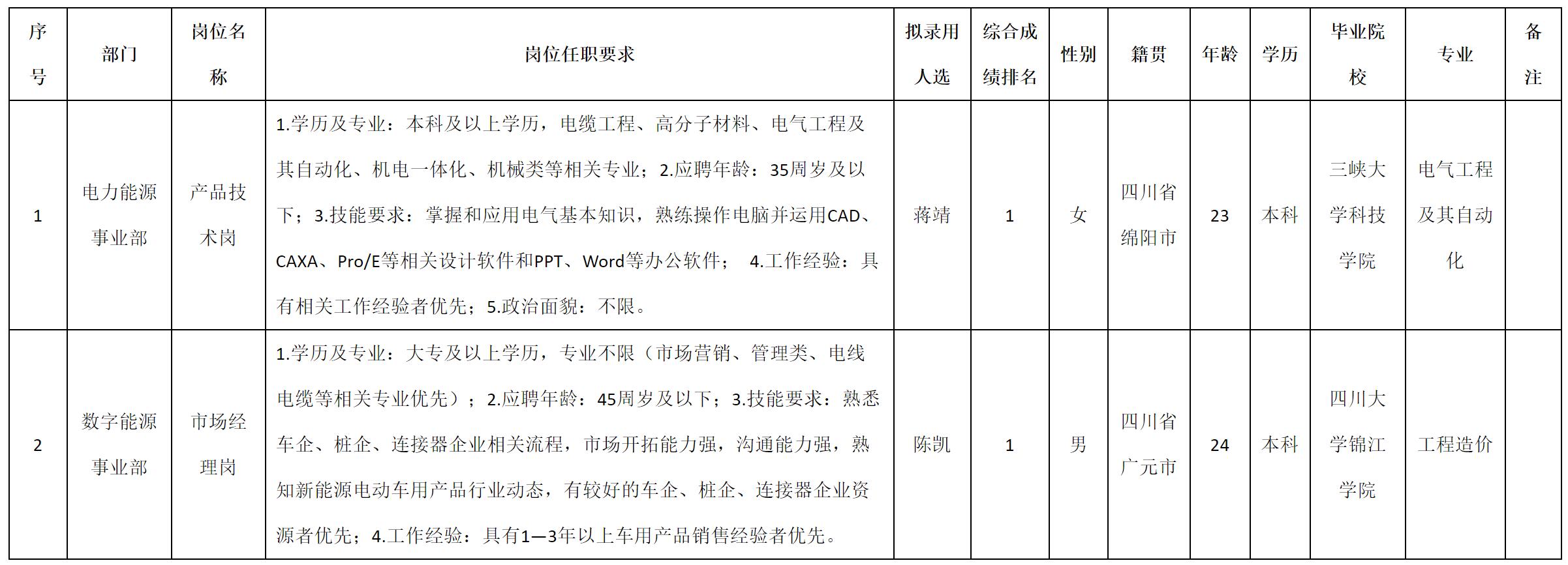 根據(jù)四川九洲線纜有限責任公司發(fā)布的招聘公告及招聘相關規(guī)定,經(jīng)測試、考察、體檢等程序,擬錄用蔣靖等2名同志到四川九洲線纜有限責任公司工作,現(xiàn)予以公示,具體情況如下:
