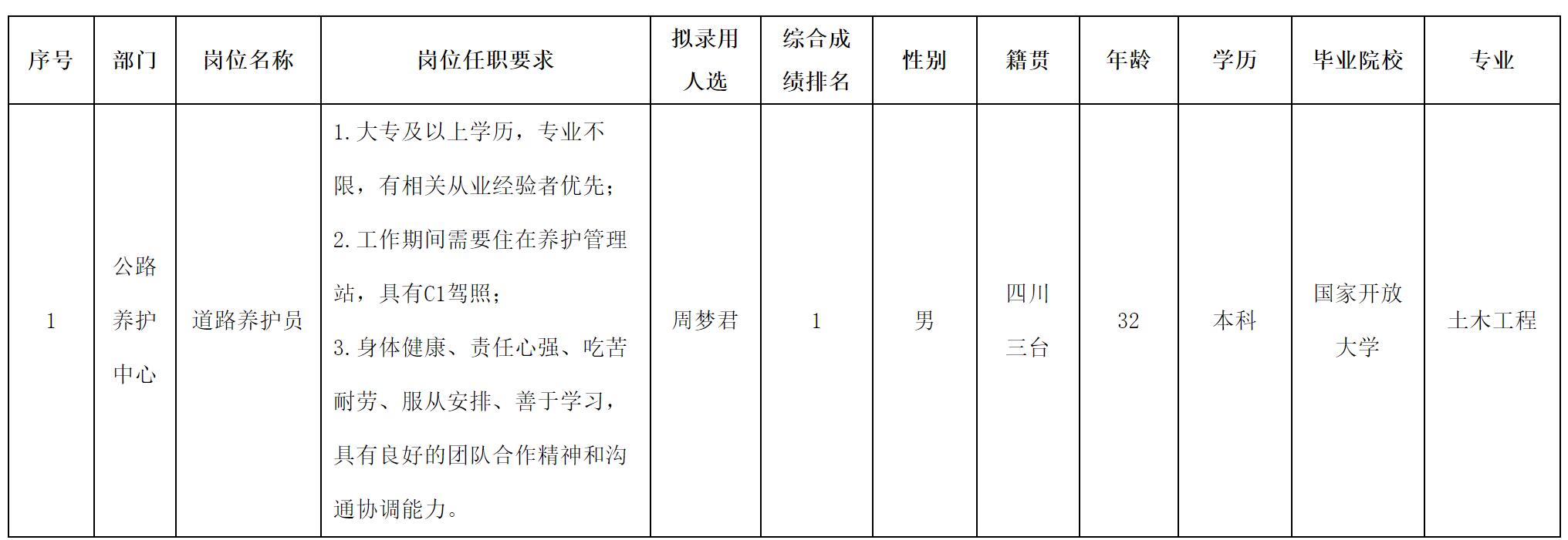 根據(jù)2025年退役軍人就業(yè)服務(wù)專項(xiàng)行動——“戎耀歸蜀”綿陽退役軍人及軍屬招聘活動及綿陽路橋建設(shè)集團(tuán)有限責(zé)任公司招聘相關(guān)規(guī)定,經(jīng)面試、考察、體檢等程序,擬錄用周夢君同志到綿陽路橋建設(shè)集團(tuán)有限責(zé)任公司工作,現(xiàn)予以公示,具體情況如下: