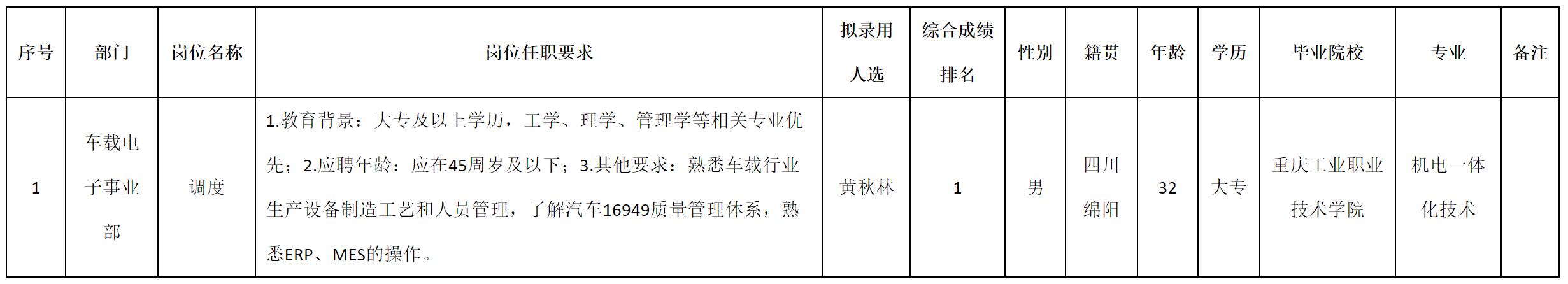 根據(jù)四川九州電子科技股份有限公司發(fā)布的招聘公告及招聘相關規(guī)定,經測試、考察、體檢等程序,擬錄用黃秋林同志到四川九州電子科技股份有限公司工作,現(xiàn)予以公示,具體情況如下: