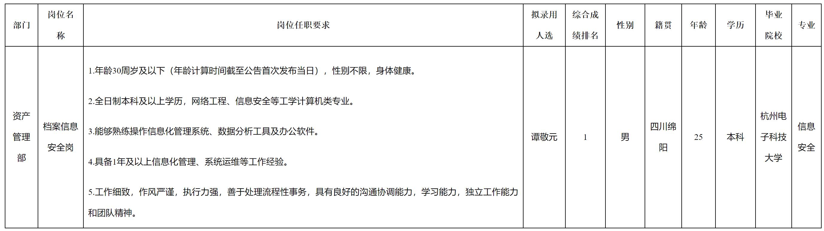 根據(jù)綿陽市綿投商業(yè)運營管理有限責任公司發(fā)布的招聘公告及招聘相關規(guī)定,經(jīng)筆試、面試、背景調(diào)查、體檢等程序,擬錄用譚敬元同志到綿陽市綿投商業(yè)運營管理有限責任公司工作,現(xiàn)予以公示,具體情況如下: