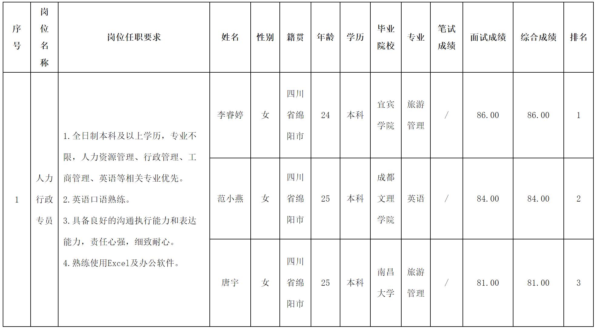 根據(jù)四川波鴻實業(yè)有限公司發(fā)布的招聘公告及招聘相關(guān)規(guī)定,現(xiàn)將測試成績予以公示。