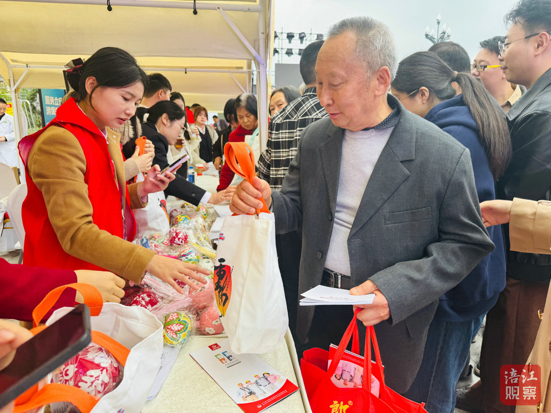 在禮包發(fā)放區(qū),裝有雞蛋、菜籽油、蜂蜜、菊花茶等康養(yǎng)食品、七曲山門票的“重陽大禮包”正有序發(fā)放到符合條件的老人手中。