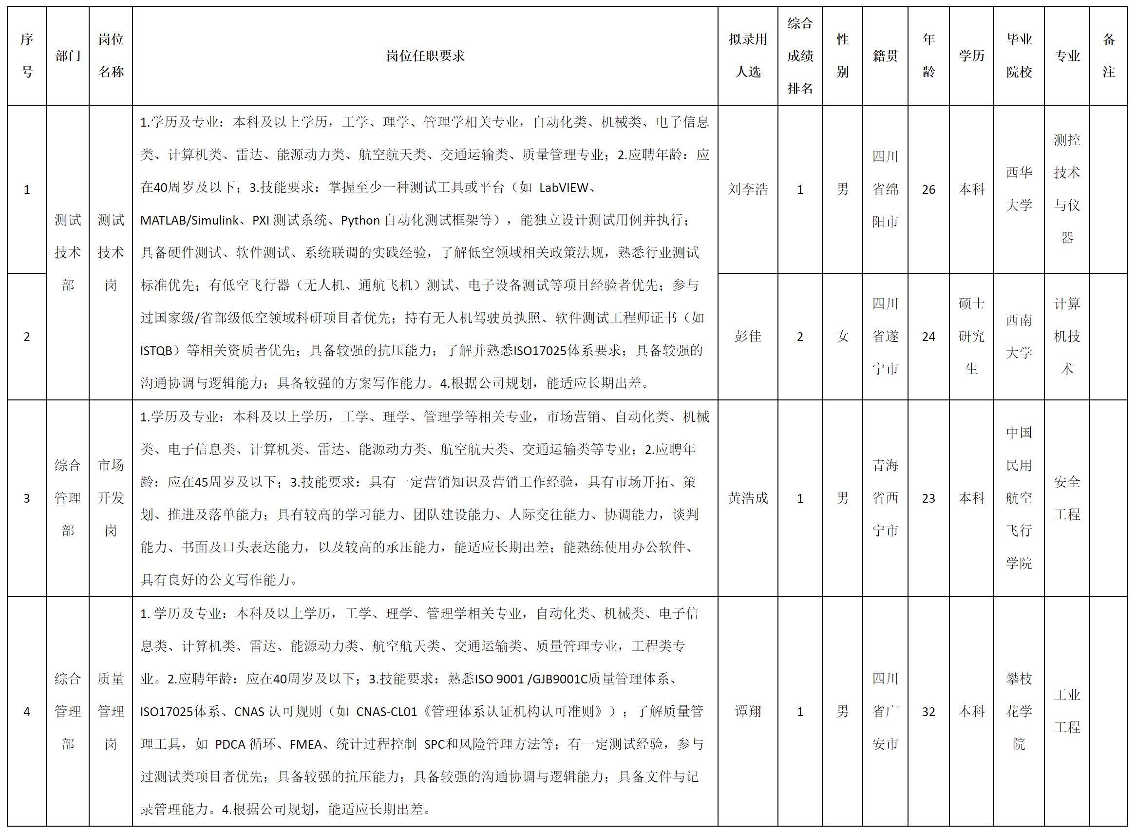 根據(jù)四川九洲永昌檢測(cè)技術(shù)服務(wù)有限責(zé)任公司發(fā)布的招聘公告及招聘相關(guān)規(guī)定,經(jīng)測(cè)試、考察、體檢等程序,擬錄用劉李浩等4名同志到四川九洲永昌檢測(cè)技術(shù)服務(wù)有限責(zé)任公司工作,現(xiàn)予以公示,具體情況如下: