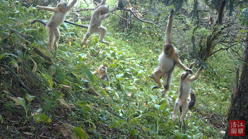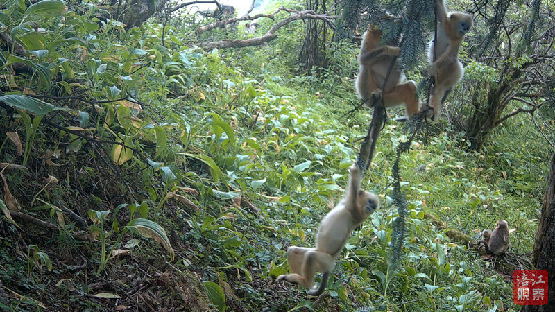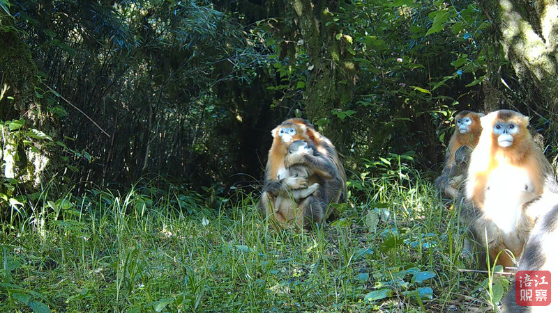 在大熊貓出現(xiàn)地方附近,川金絲猴的“日常”生活同樣鮮活。畫面中——