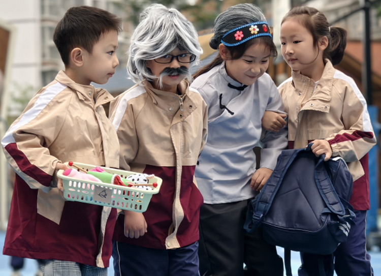 升旗儀式上,伴隨著嘹亮的國歌,五星紅旗在晨光中冉冉升起。孩子們身著整齊服裝,挺直小身板,目光緊緊追隨著國旗,將對祖國的敬意與對長輩的感恩之情融入歌聲里。隨后,大三班幼兒帶來精彩的“敬老”主題展示,童謠《九月九》清脆動(dòng)聽,孩子們邊唱邊模仿捶背、遞水等照顧長輩的動(dòng)作;情景劇《當(dāng)你老了》溫情上演,稚嫩的表演把扶老人過馬路、幫長輩做家務(wù)等場景生動(dòng)呈現(xiàn),讓“敬老”從抽象概念變?yōu)榭吹靡姷臏嘏袆?dòng)。