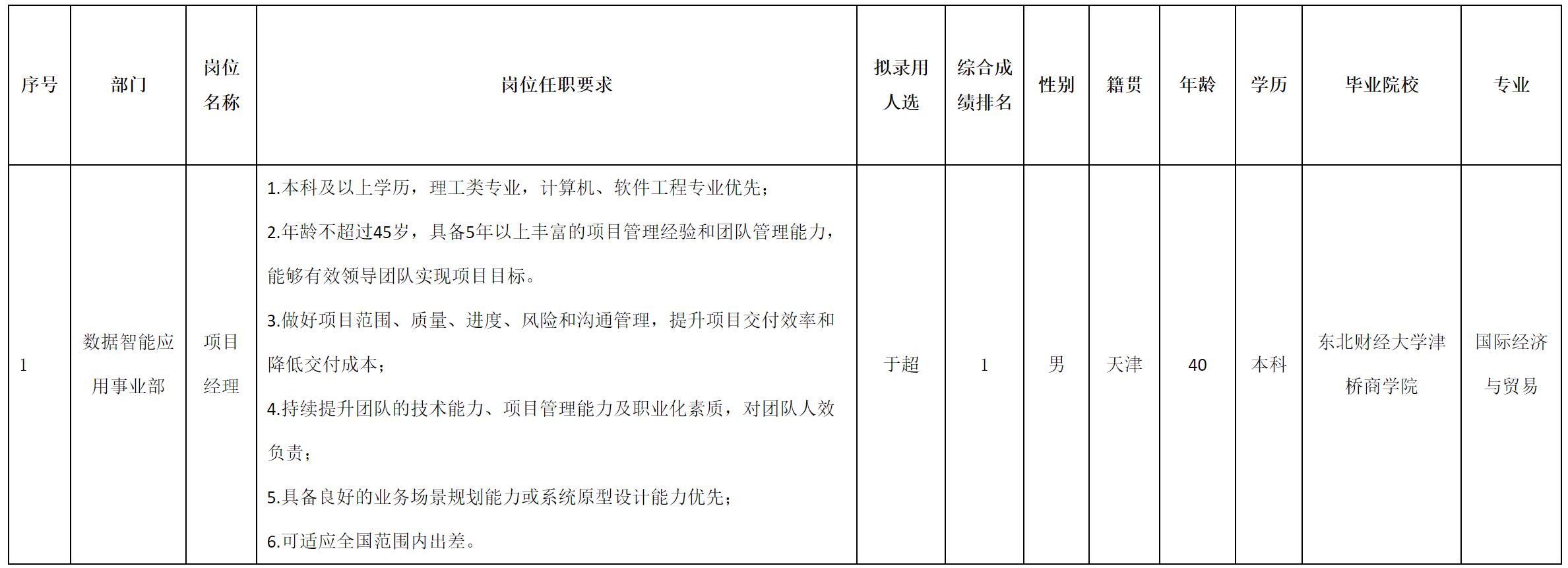 根據(jù)四川虹信軟件股份有限公司發(fā)布的招聘公告及招聘相關規(guī)定,經(jīng)測試、考察、體檢等程序,擬錄用于超同志到四川虹信軟件股份有限公司工作,現(xiàn)予以公示,具體情況如下: