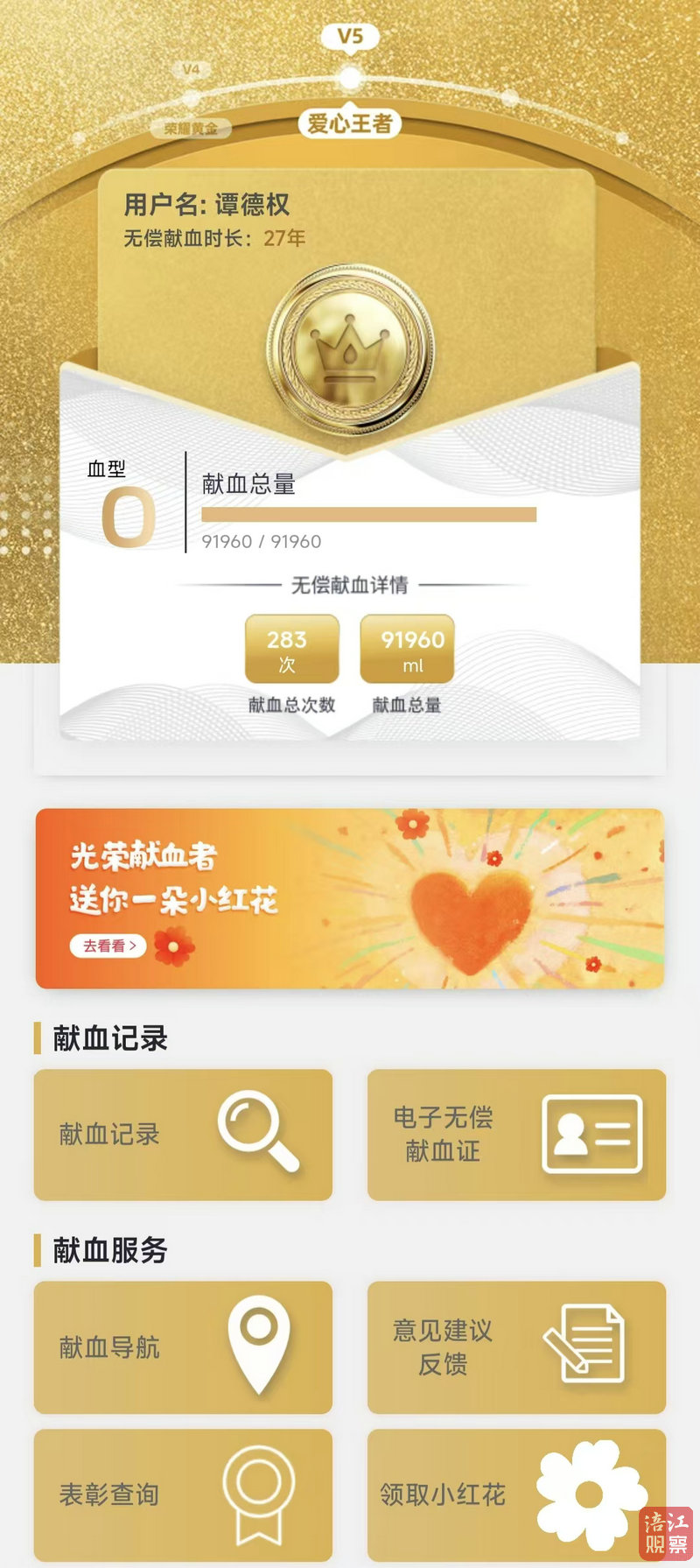 除了號召大家加入無償獻(xiàn)血隊(duì)伍,譚德權(quán)自己也堅(jiān)持獻(xiàn)血了27年,獻(xiàn)血次數(shù)283次,累計(jì)獻(xiàn)血量達(dá)91960毫升,相當(dāng)于23名成人全身血量總和,為459位陌生人筑起了生命的防線。