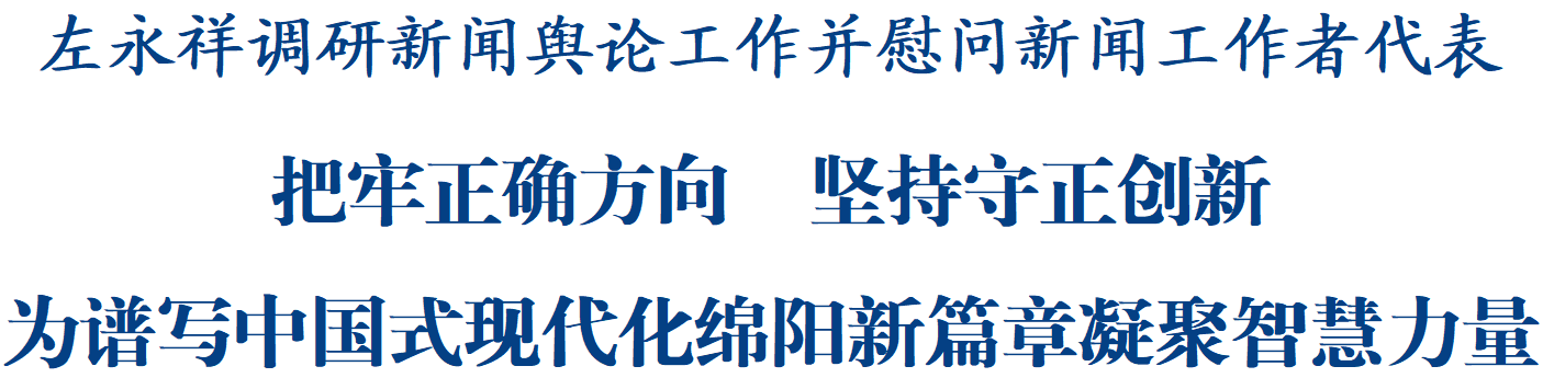調(diào)研中,左永祥代表市委、市政府向全市廣大新聞工作者致以節(jié)日問候,向大家長期以來的辛勤付出表示感謝,對全市新聞輿論工作取得的成績給予肯定,并宣講黨的二十屆四中全會精神。他指出,學習宣傳貫徹黨的二十屆四中全會精神,是全市上下當前和今后一個時期的重要政治任務,要精心組織傳達學習,廣泛開展宣傳宣講,著力營造濃厚氛圍。面對新形勢新任務,新聞媒體要站在鞏固黨的執(zhí)政基礎、維護意識形態(tài)安全、服務綿陽發(fā)展大局的高度,在譜寫中國式現(xiàn)代化綿陽新篇章進程中展現(xiàn)新?lián)斝伦鳛椤R獔猿贮h媒姓黨,自覺把擁護“兩個確立”、做到“兩個維護”落實到新聞輿論工作的各方面全過程,加強思想政治建設,增強政治敏銳性和政治鑒別力,堅決守好意識形態(tài)陣地,研究好闡釋好傳播好新時代黨的創(chuàng)新理論,確保新聞輿論工作始終沿著正確方向前進。要圍繞全市中心工作,把鏡頭和筆觸聚焦到推動高質量發(fā)展生動實踐和群眾關切的民生實事上來,創(chuàng)作更多貼近時代、貼近群眾、貼近生活的精品力作,講好綿陽故事、傳播綿陽聲音、展示綿陽形象,鞏固壯大全市上下奮進新時代的主流思想輿論。要銳意改革創(chuàng)新,創(chuàng)新數(shù)字時代新聞傳播手段、方式和載體,積極拓展“新聞+”發(fā)展模式,走好新聞媒體賦能文旅深度融合發(fā)展路徑,激發(fā)媒體轉型的“內(nèi)生動力”。要強化人才引領,加強班子隊伍建設和人才工作,健全新聞宣傳人才培養(yǎng)、使用、激勵等機制,提升專業(yè)素養(yǎng)能力,著力打造一支政治堅定、業(yè)務精湛、作風優(yōu)良的新聞輿論工作隊伍。