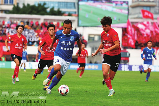 進入補時階段,比賽激烈程度再度升級:德陽隊多次發(fā)力沖擊綿陽隊禁區(qū),均未能突破防線;綿陽隊則在鞏固禁區(qū)防守的同時,伺機發(fā)起反攻?,F(xiàn)場球迷吶喊聲此起彼伏,雙方全力沖刺爭奪,最終主裁判吹響終場哨,綿陽九洲長虹隊與德陽重裝隊1∶1握手言和。