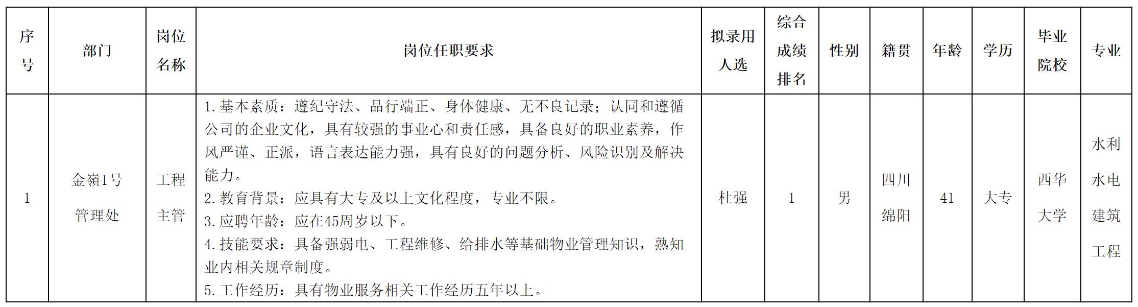 根據(jù)四川長(zhǎng)虹物業(yè)服務(wù)有限責(zé)任公司綿陽(yáng)分公司發(fā)布的招聘公告及招聘相關(guān)規(guī)定,經(jīng)面試、考察、體檢等程序,擬錄用杜強(qiáng)同志到金嶺1號(hào)管理處工作,現(xiàn)予以公示,具體情況如下: