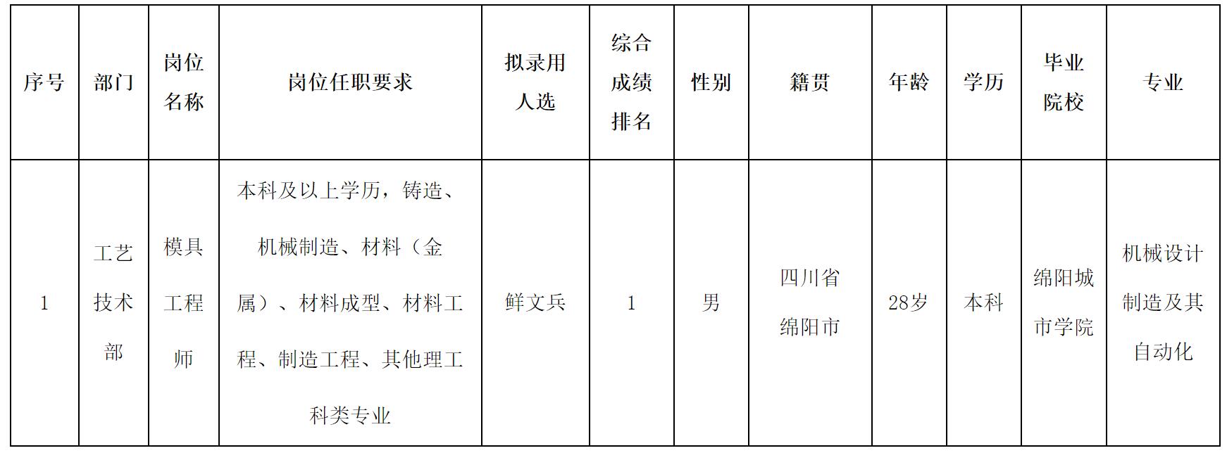 根據(jù)四川波鴻實業(yè)有限公司發(fā)布的招聘公告及招聘相關(guān)規(guī)定,經(jīng)面試、體檢等程序,擬錄用鮮文兵同志到四川威斯卡特工業(yè)有限公司綿陽分公司工作,現(xiàn)予以公示,具體情況如下: