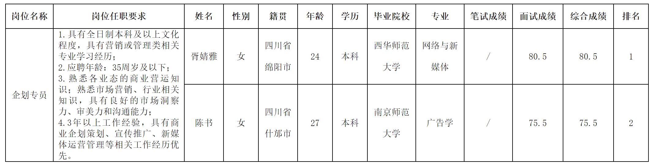 根據(jù)四川長虹繽紛時代商業(yè)管理有限公司發(fā)布的招聘公告及招聘相關(guān)規(guī)定,現(xiàn)將測試成績予以公示。