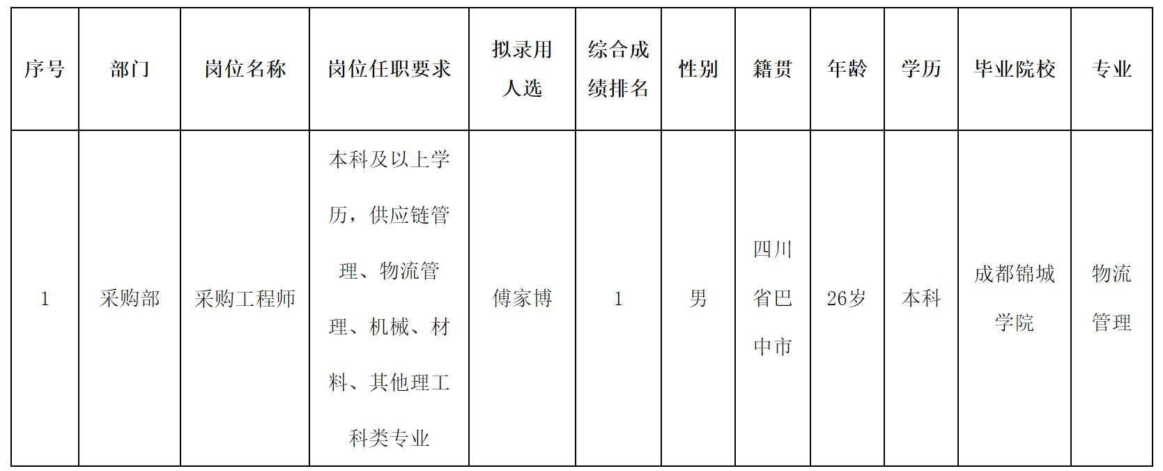 根據(jù)四川波鴻實業(yè)有限公司發(fā)布的招聘公告及招聘相關(guān)規(guī)定,經(jīng)面試、體檢等程序,擬錄用傅家博同志到四川威斯卡特工業(yè)有限公司綿陽分公司工作,現(xiàn)予以公示,具體情況如下: