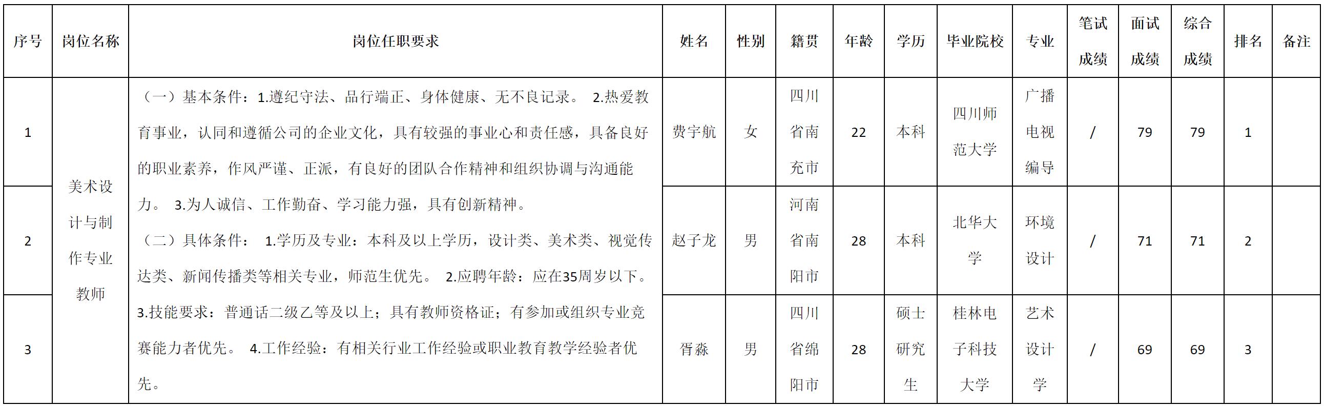 根據(jù)四川九洲教育投資管理有限公司發(fā)布的招聘公告及招聘相關(guān)規(guī)定,現(xiàn)將測(cè)試成績(jī)予以公示。