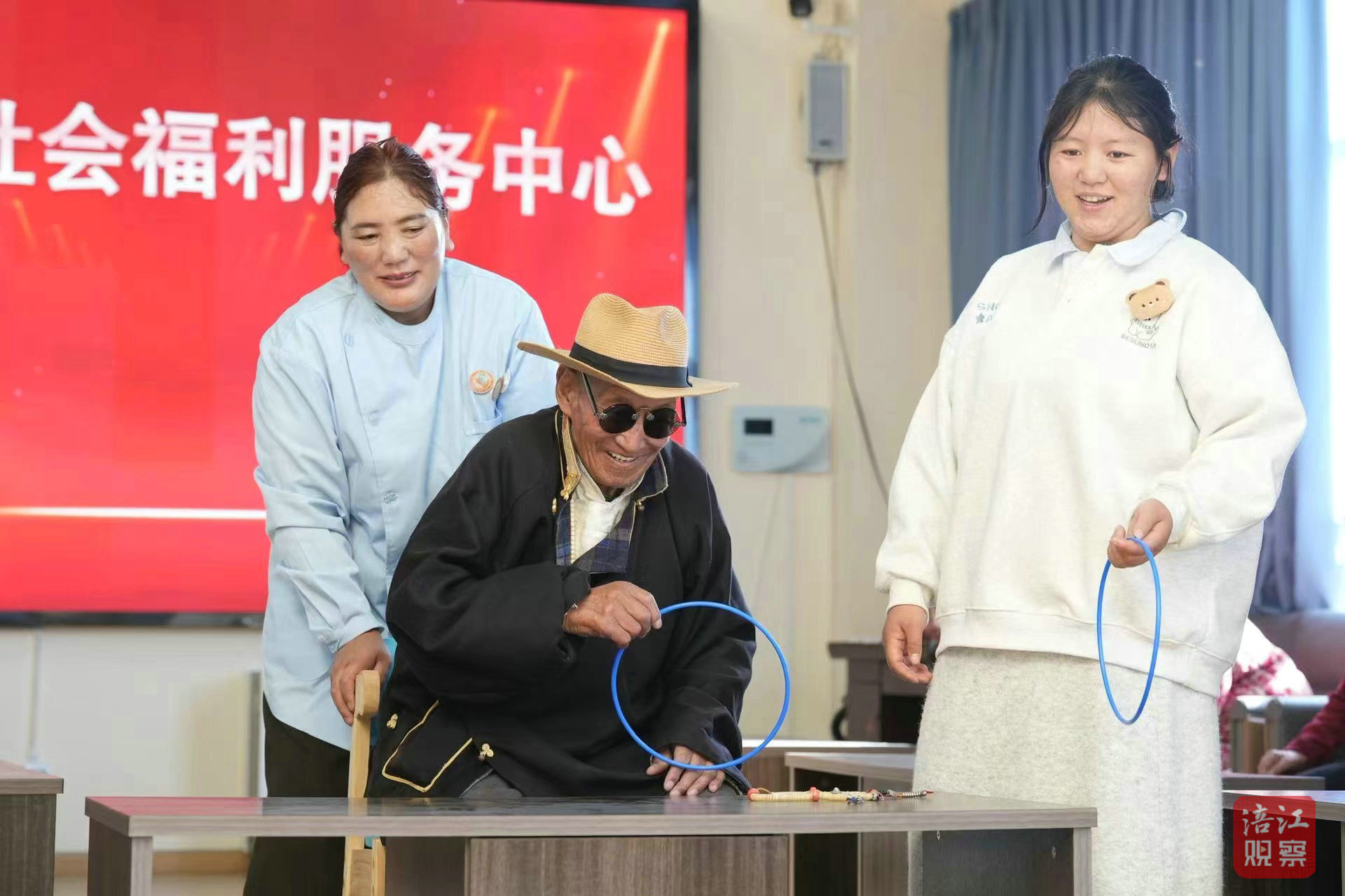 “卡卓扎西(謝謝吉祥)。我是個孤寡老人,是國家給我這么好的生活。這邊的條件好,吃穿好,護工也對我們很好,很感謝你們!福利院好得很。”老人貫洛感慨地說。