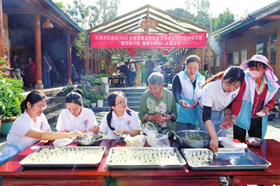 志愿者在云南省大理白族自治州南澗彝族自治縣南澗鎮(zhèn)西山村幸福小院內(nèi)為老人包餃子(2025年10月29日攝)。 新華社發(fā) 適志宏 攝