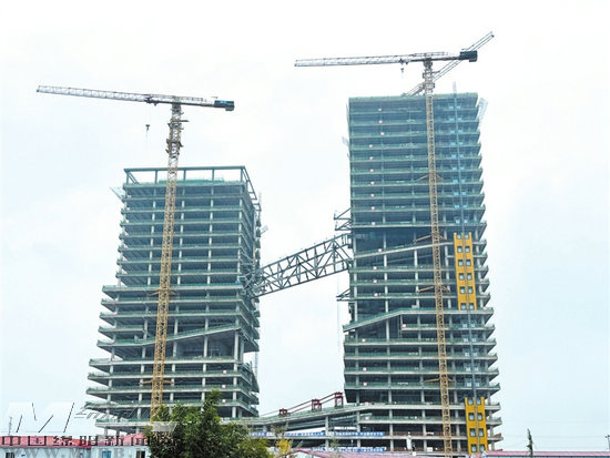 記者在現(xiàn)場看到,項(xiàng)目主體結(jié)構(gòu)已經(jīng)基本成型,工人們在各自崗位上來回穿梭,機(jī)械聲、電焊聲不絕于耳,一片繁忙的景象。兩幢高樓之間,一座鋼連廊懸空而架,看上去十分壯觀。
