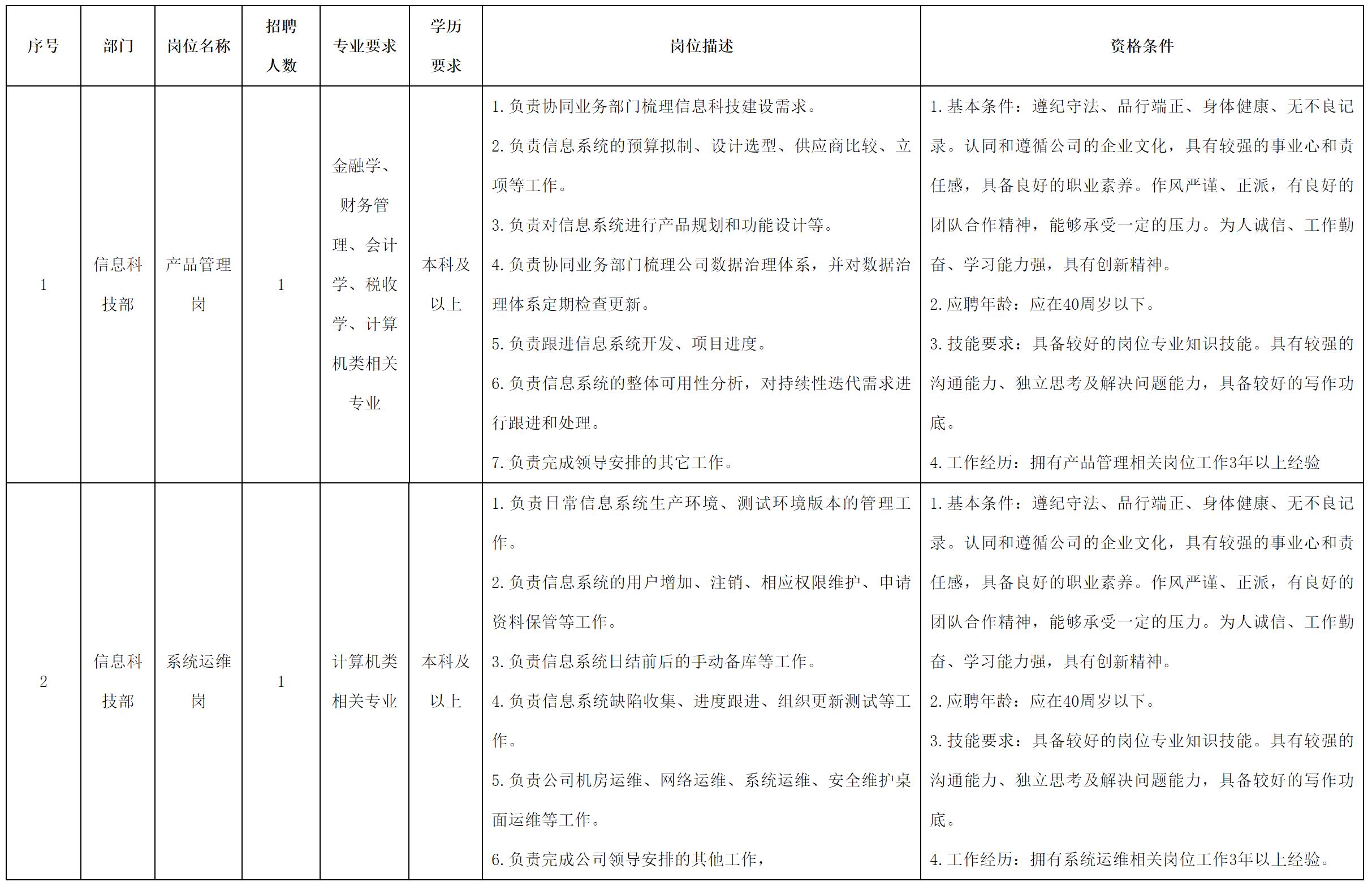 現(xiàn)因經(jīng)營發(fā)展需要,公開招聘產(chǎn)品管理崗、系統(tǒng)運維崗各1名: