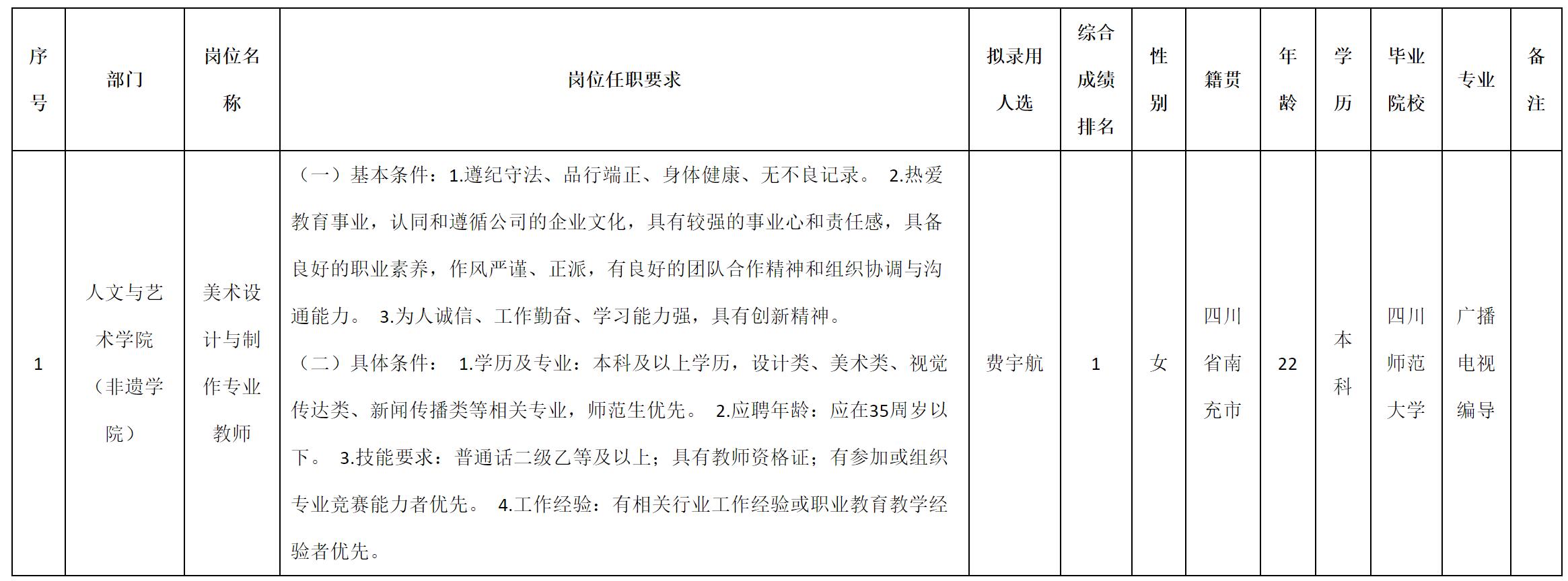 根據(jù)四川九洲教育投資管理有限公司發(fā)布的招聘公告及招聘相關(guān)規(guī)定,經(jīng)測試、考察、體檢等程序,擬錄用費宇航同志到四川九洲教育投資管理有限公司工作,現(xiàn)予以公示,具體情況如下: