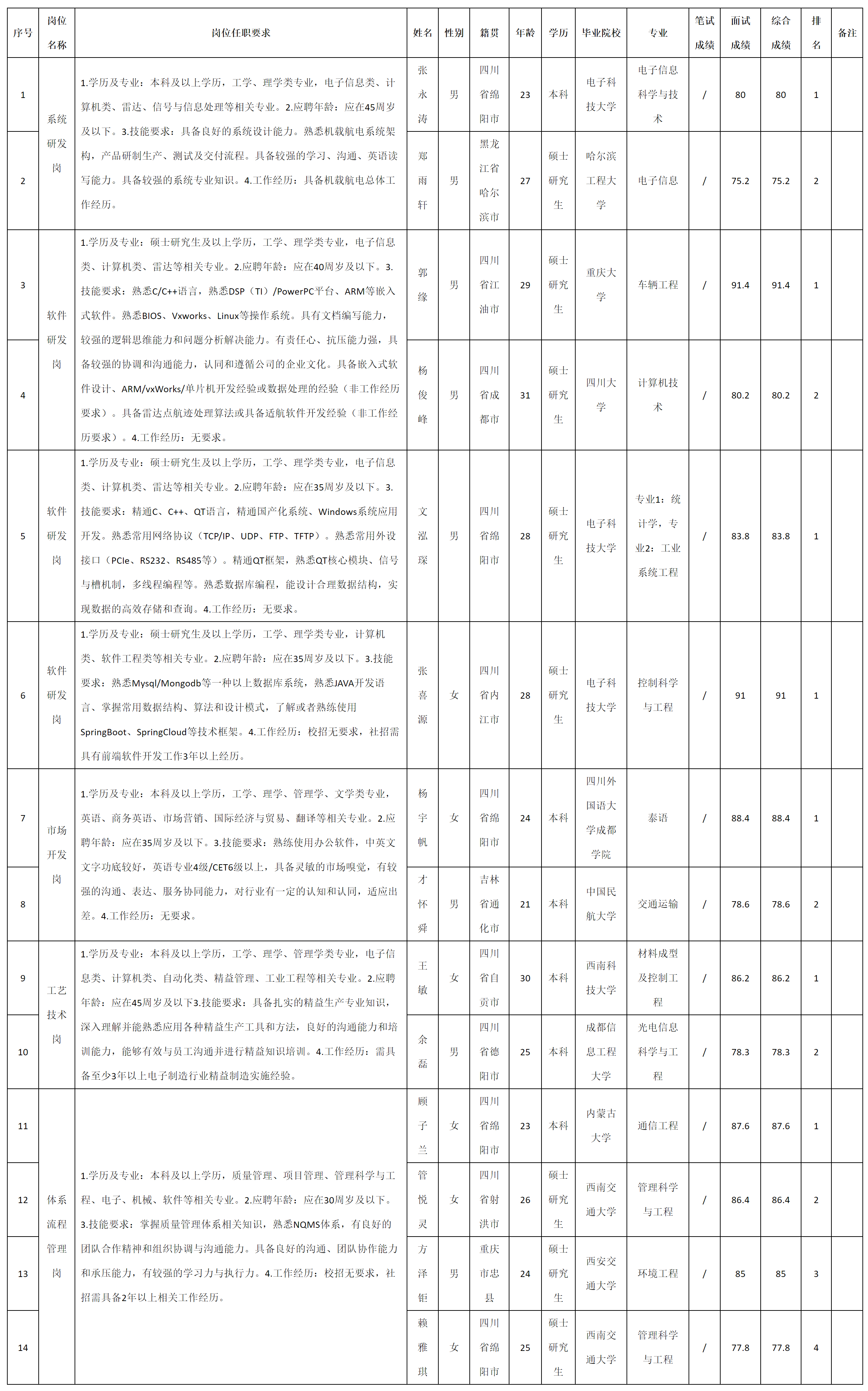 根據(jù)四川九洲空管科技有限責(zé)任公司發(fā)布的招聘公告及招聘相關(guān)規(guī)定,現(xiàn)將測試成績予以公示。