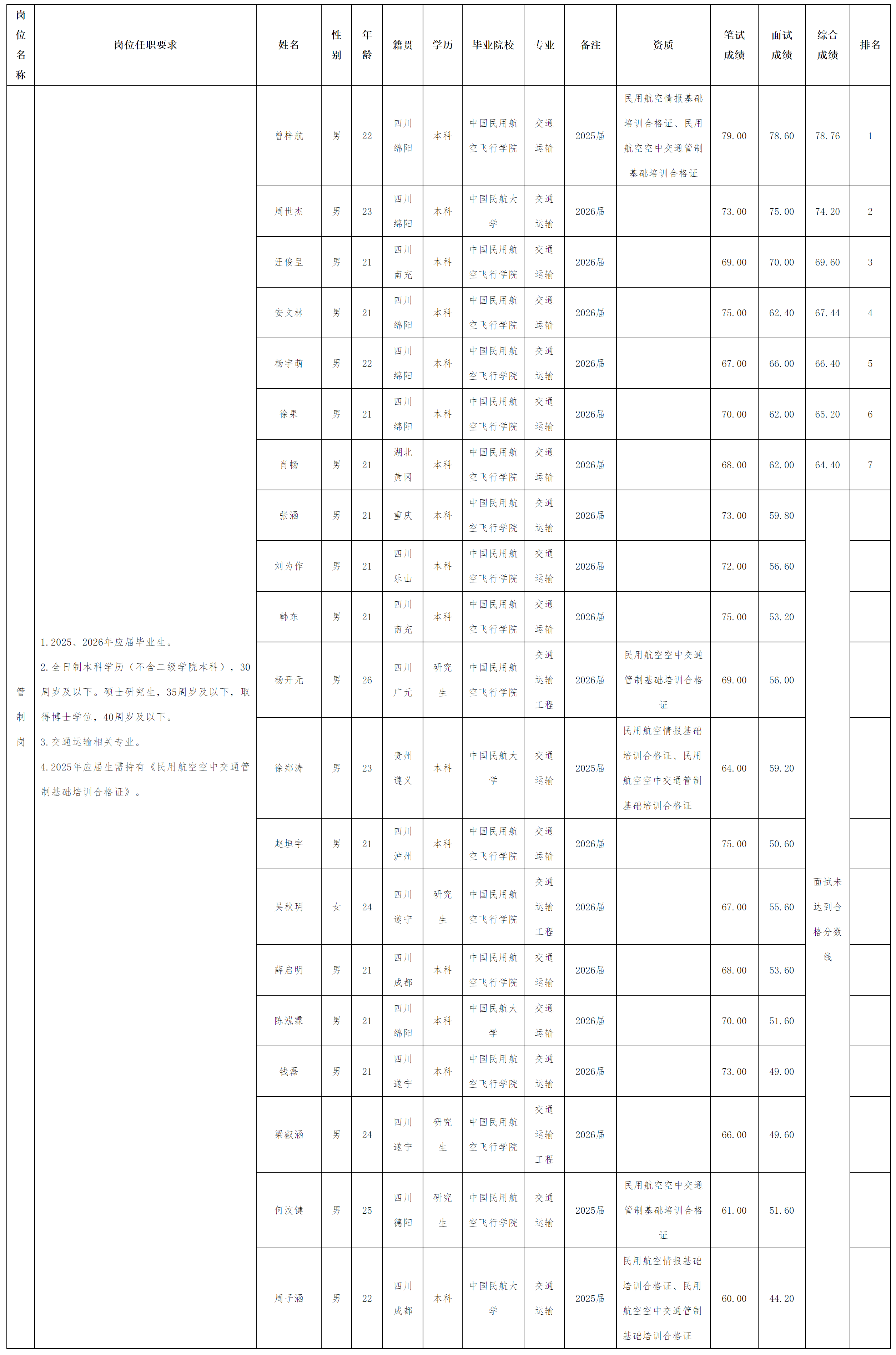 根據綿陽機場(集團)有限公司2025年10月發(fā)布的《關于2025年秋季招聘管制崗位的公告》以及招聘相關規(guī)定,現(xiàn)將管制崗位筆試、面試、綜合成績按照排名予以公示。