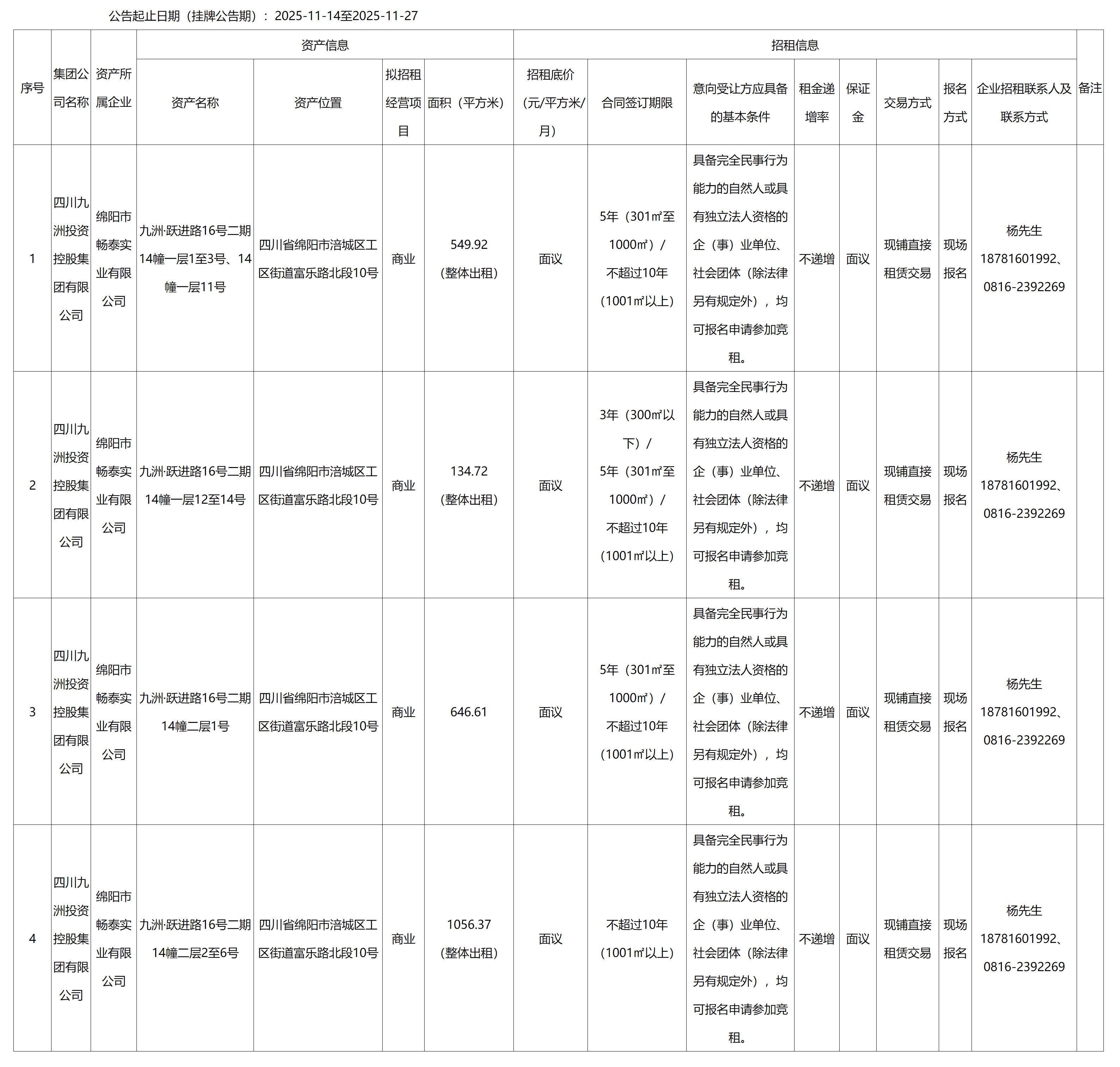四川九洲千城商業(yè)管理有限公司九洲躍進(jìn)路16號(hào)二期14幢樓商鋪出租公告