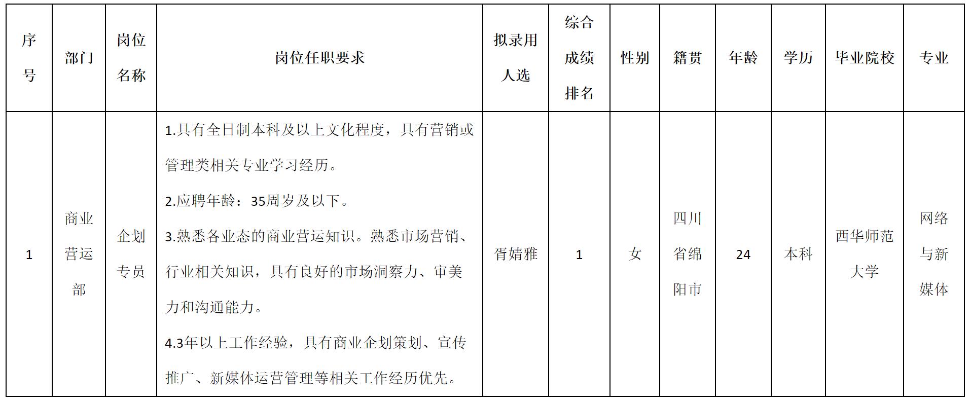 根據(jù)四川長(zhǎng)虹繽紛時(shí)代商業(yè)管理有限公司發(fā)布的招聘公告及招聘相關(guān)規(guī)定,經(jīng)面試、考察、體檢等程序,擬錄用胥婧雅同志到公司工作,現(xiàn)予以公示,具體情況如下: