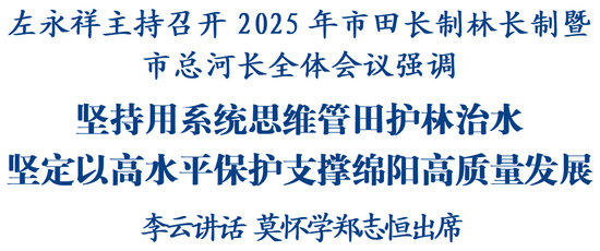綿陽新聞網(wǎng)訊 11月20日,2025年市田長(zhǎng)制林長(zhǎng)制暨市總河長(zhǎng)全體會(huì)議召開,省委常委、市委書記左永祥主持會(huì)議并講話。他強(qiáng)調(diào),要深入學(xué)習(xí)貫徹習(xí)近平生態(tài)文明思想和習(xí)近平總書記對(duì)四川工作系列重要指示精神,全面落實(shí)黨中央、國(guó)務(wù)院和省委、省政府決策部署,堅(jiān)持用系統(tǒng)思維管田、護(hù)林、治水,推動(dòng)田長(zhǎng)制、林長(zhǎng)制、河湖長(zhǎng)制走深走實(shí),堅(jiān)定以高水平保護(hù)支撐綿陽高質(zhì)量發(fā)展。