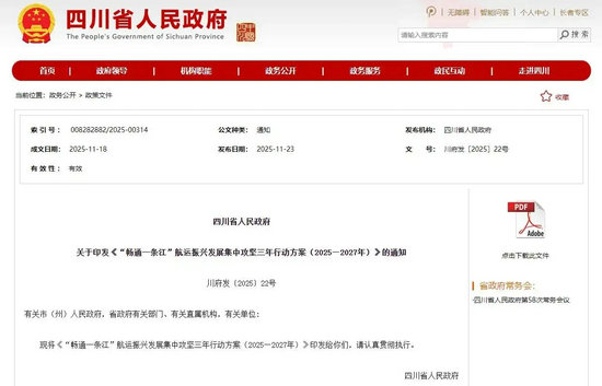 據(jù)四川省人民政府網站消息,為加快交通強省建設,補齊水運基礎設施短板,推動物流降本提質增效,更好服務全省經濟社會發(fā)展,結合水運發(fā)展實際,近日,省政府印發(fā)了《“暢通一條江”航運振興發(fā)展集中攻堅三年行動方案(2025—2027年)》(以下簡稱《方案》)。