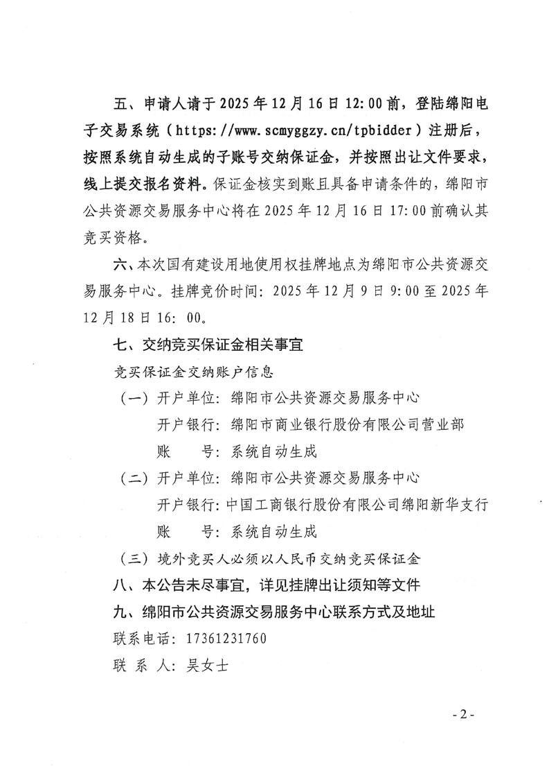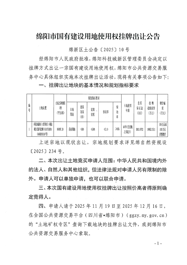 綿陽市國(guó)有建設(shè)用地使用權(quán)掛牌出讓公告(綿新區(qū)土公告〔2025〕10號(hào))