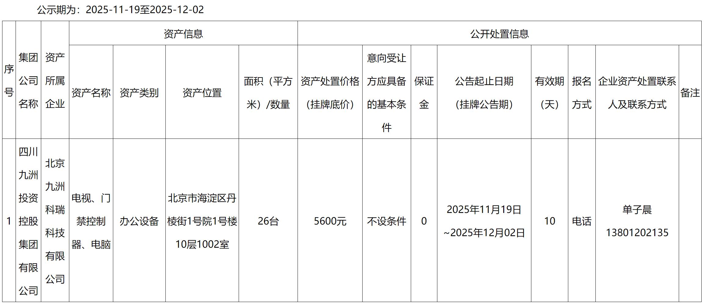 北京九洲科瑞科技有限公司電視、電腦等資產(chǎn)處置公告