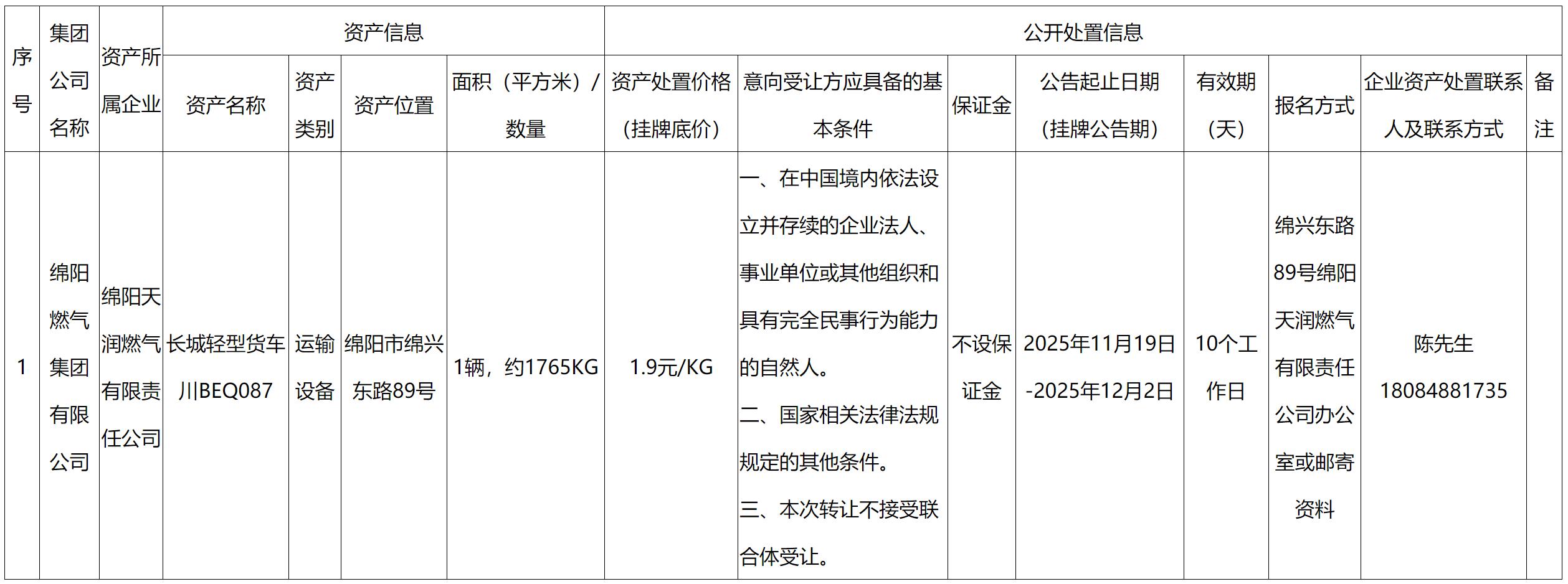 綿陽天潤燃氣有限責(zé)任公司資產(chǎn)處置公告