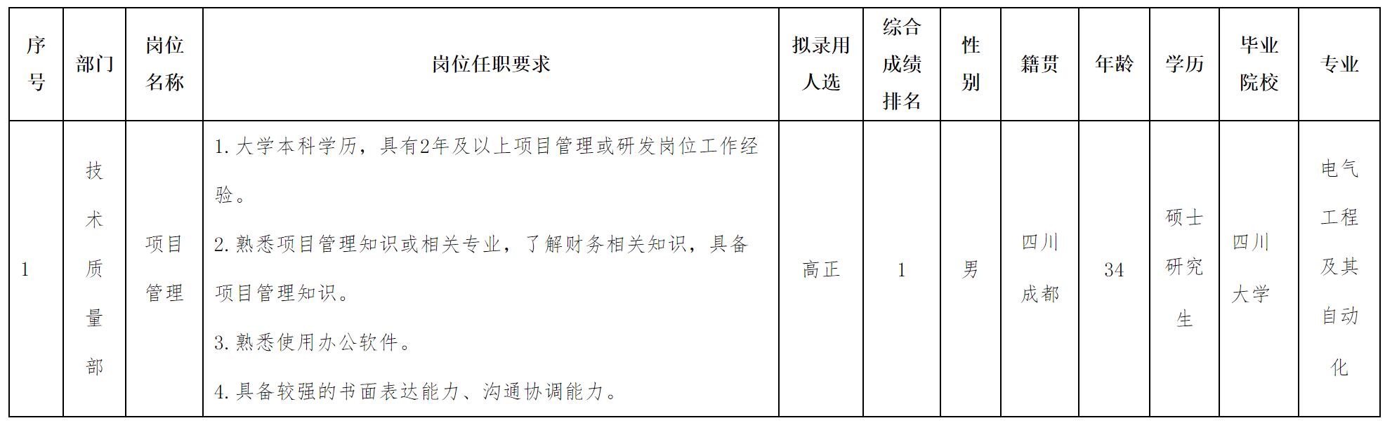 根據(jù)四川華豐科技股份有限公司發(fā)布的招聘公告及招聘相關(guān)規(guī)定,經(jīng)測(cè)試等程序,擬錄用高正同志到四川華豐科技股份有限公司工作,現(xiàn)予以公示,具體情況如下: