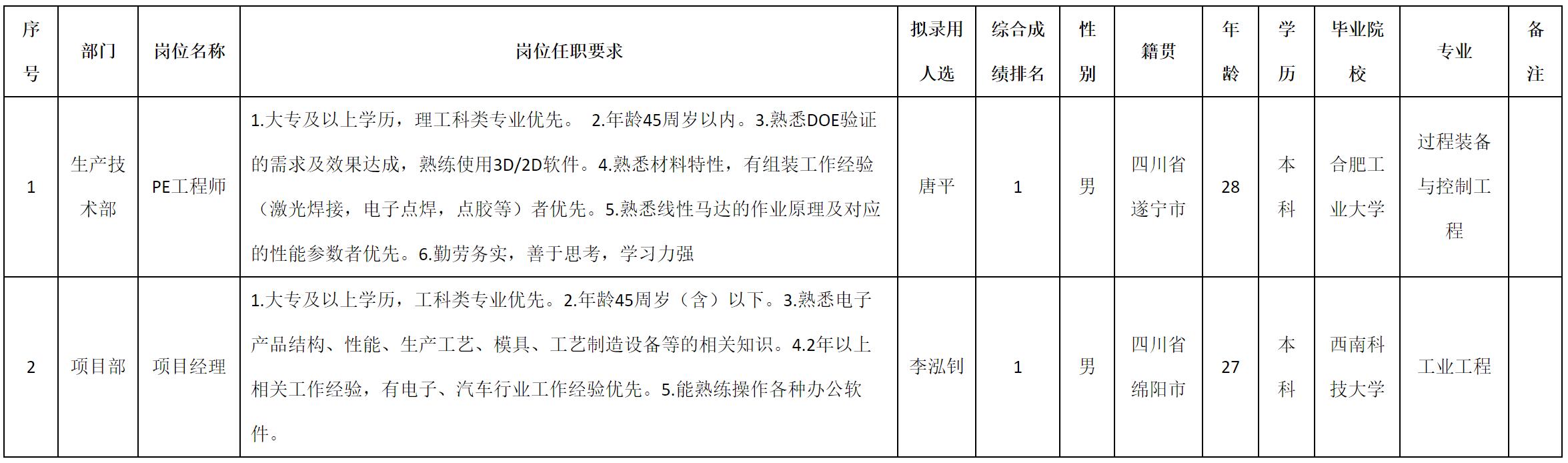 根據(jù)四川安和精密電子電器股份有限公司發(fā)布的招聘公告及招聘相關(guān)規(guī)定,經(jīng)測試、考察、體檢等程序,擬錄用唐平等2名同志到四川安和精密電子電器股份有限公司工作,現(xiàn)予以公示,具體情況如下: