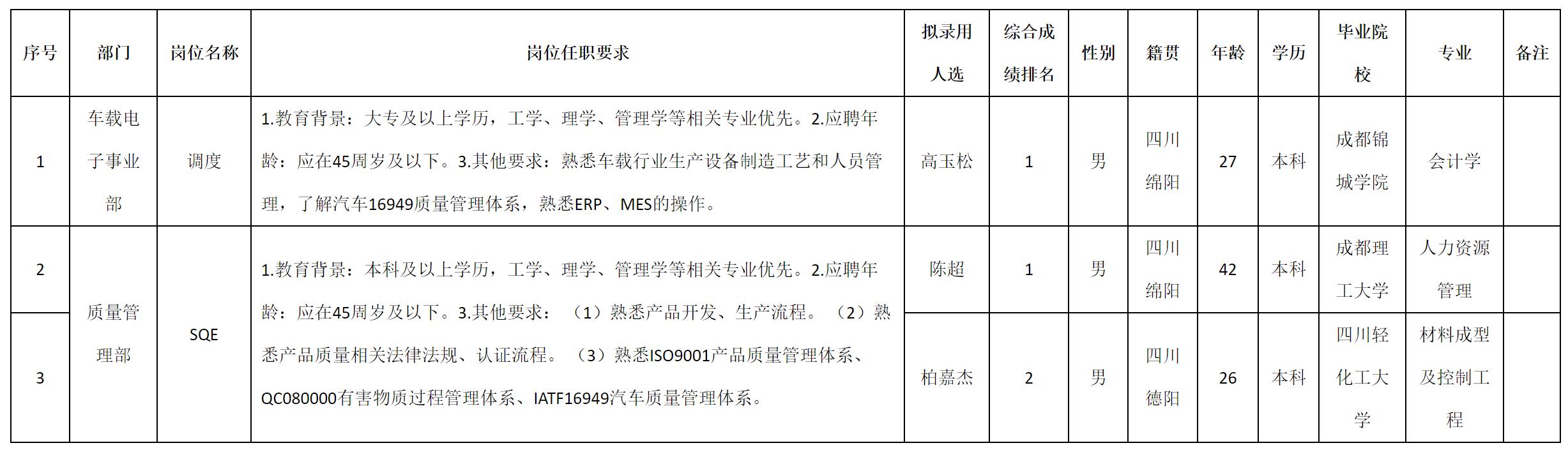 根據(jù)四川九州電子科技股份有限公司發(fā)布的招聘公告及招聘相關(guān)規(guī)定,經(jīng)測(cè)試、考察、體檢等程序,擬錄用高玉松等3名同志到四川九州電子科技股份有限公司工作,現(xiàn)予以公示,具體情況如下: