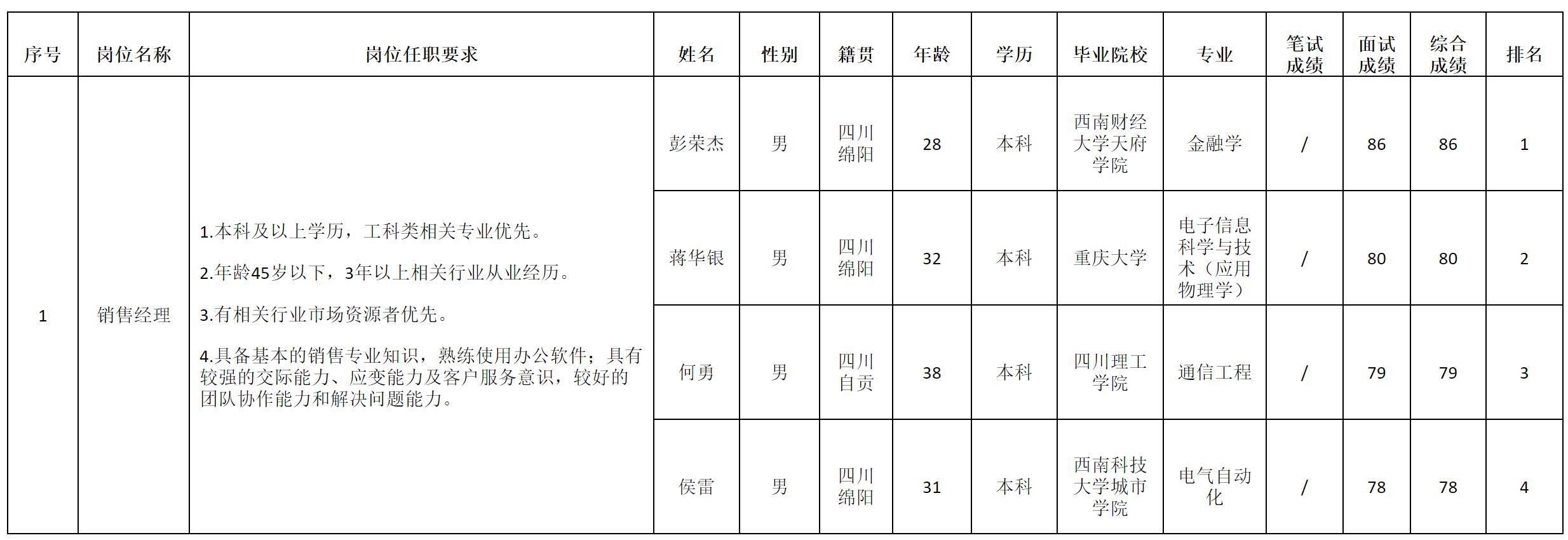 根據(jù)四川長虹電子科技有限公司發(fā)布的招聘公告及招聘相關(guān)規(guī)定,經(jīng)面試等程序,現(xiàn)將面試成績予以公示。