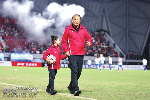10月25日晚,川超綿陽(yáng)九洲長(zhǎng)虹隊(duì)對(duì)陣廣元?jiǎng)﹂T雄關(guān)隊(duì)的比賽現(xiàn)場(chǎng),中國(guó)工程物理研究院(簡(jiǎn)稱“中物院”)老一輩科研工作者子弟、四川省足球協(xié)會(huì)原秘書長(zhǎng)李日新,與中物院新生代科研工作者子女、綿陽(yáng)科學(xué)城春蕾學(xué)校學(xué)生韓思媛,攜手為比賽開球。