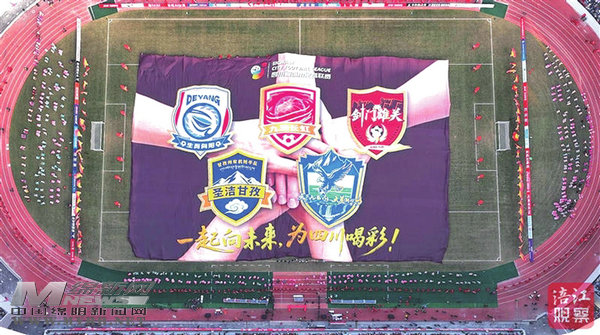 11月23日,綿陽(yáng)九洲長(zhǎng)虹隊(duì)主場(chǎng)對(duì)陣阿壩雪山雄鷹隊(duì)。圖為川北5支球隊(duì)的巨型Tifo(看臺(tái)拼圖)在體育場(chǎng)中間展開。 視覺綿陽(yáng)資料圖片