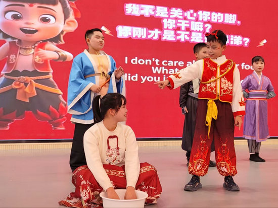 一年級(jí)以合唱《Hello & Baby Shark》《Big Big World》帶來(lái)萌趣開(kāi)場(chǎng),稚嫩聲線里滿是對(duì)英語(yǔ)的熱愛(ài);五年級(jí)用情景劇《Ne Zha》《The Mid-Autumn Festival》將中國(guó)傳統(tǒng)神話故事與英語(yǔ)表演相結(jié)合,既展現(xiàn)了英語(yǔ)的表現(xiàn)力,又弘揚(yáng)了傳統(tǒng)文化;二年級(jí)的說(shuō)唱串燒《A Little Love》節(jié)奏輕快,將日常英語(yǔ)融入動(dòng)感旋律;六年級(jí)則以《Qiu Shaoyun》《Lu Xun》《Hua Mulan》主題演講搭配才藝秀,讓紅色故事、經(jīng)典人物通過(guò)英語(yǔ)傳遞出別樣感染力;四年級(jí)的故事串燒《Monkeys’ Adventures & A Brave Heroine》帶大家走進(jìn)奇妙的英語(yǔ)世界;三年級(jí)合唱《The Hokey Pokey & I Can》,整齊的歌聲體現(xiàn)出他們?cè)鷮?shí)的英語(yǔ)基礎(chǔ)和集體凝聚力。最后,一首動(dòng)聽(tīng)的《Proud of You》溫暖全場(chǎng)。