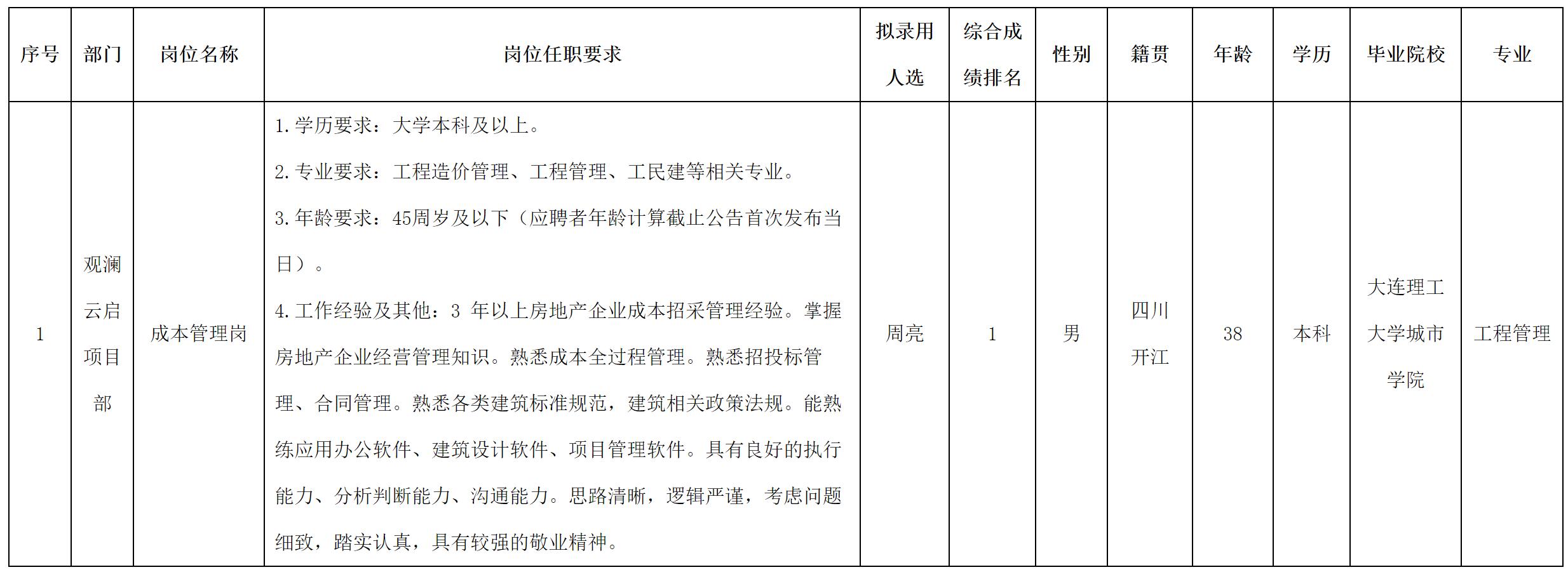 根據(jù)綿陽(yáng)市綿投置地有限公司發(fā)布的招聘公告及招聘相關(guān)規(guī)定,經(jīng)筆試、面試、考察、體檢等程序,擬錄用周亮同志到綿陽(yáng)市綿投置地有限公司工作,現(xiàn)予以公示,具體情況如下:
