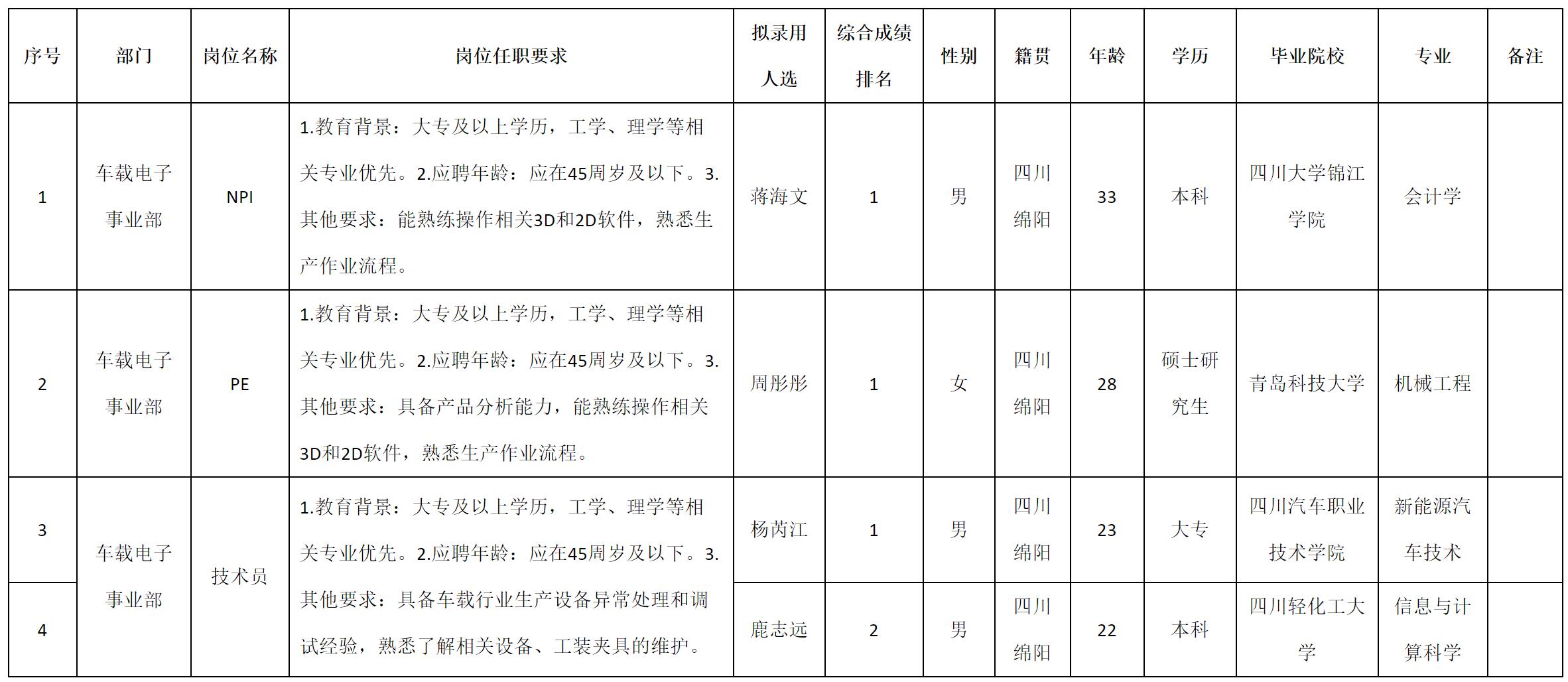 根據(jù)四川九州電子科技股份有限公司發(fā)布的招聘公告及招聘相關(guān)規(guī)定,經(jīng)測(cè)試、考察、體檢等程序,擬錄用蔣海文等4名同志到四川九州電子科技股份有限公司工作,現(xiàn)予以公示,具體情況如下:
