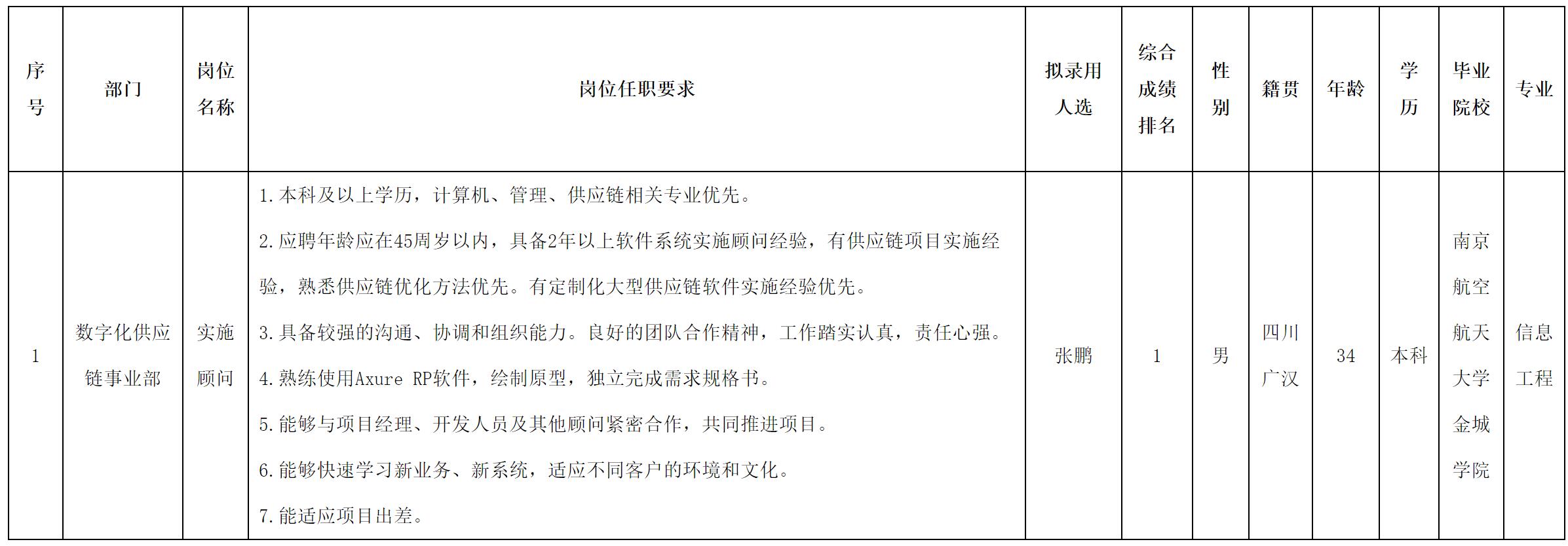 根據(jù)四川虹信軟件股份有限公司發(fā)布的招聘公告及招聘相關(guān)規(guī)定,經(jīng)測(cè)試、考察、體檢等程序,擬錄用張鵬同志到四川虹信軟件股份有限公司工作,現(xiàn)予以公示,具體情況如下: