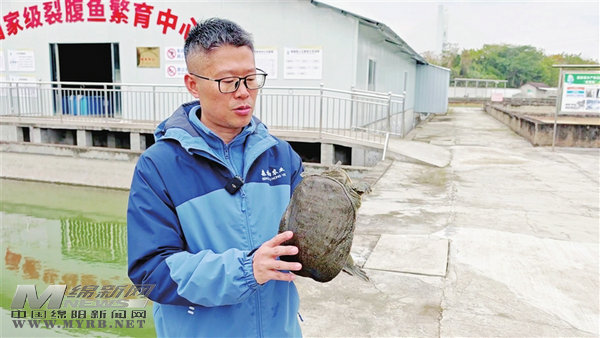 甲魚養(yǎng)殖基地負(fù)責(zé)人陳彬展示甲魚新品種“圌山1號(hào)”。 記者 陳元松 攝