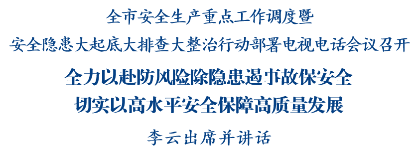 11月28日,全市安全生產(chǎn)重點(diǎn)工作調(diào)度暨安全隱患大起底大排查大整治行動(dòng)部署電視電話會(huì)議召開,分析當(dāng)前安全生產(chǎn)形勢(shì),安排部署下一步工作,市委副書記、市長(zhǎng)李云出席會(huì)議并講話,強(qiáng)調(diào)要深入學(xué)習(xí)貫徹習(xí)近平總書記關(guān)于安全生產(chǎn)的重要論述,認(rèn)真落實(shí)中央和省市部署要求,時(shí)刻繃緊安全生產(chǎn)工作思想之弦,全力以赴防風(fēng)險(xiǎn)、除隱患、遏事故、保安全,切實(shí)以高水平安全保障高質(zhì)量發(fā)展。