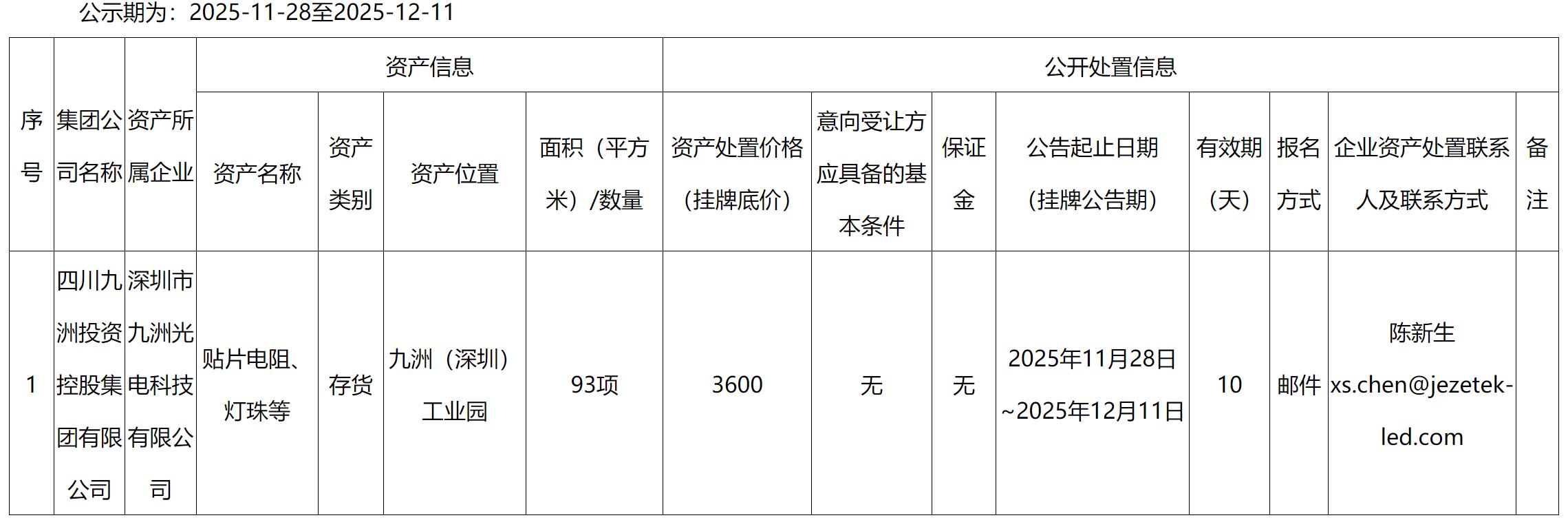 深圳市九洲光電科技有限公司貼片電阻、燈珠等存貨資產(chǎn)處置公告